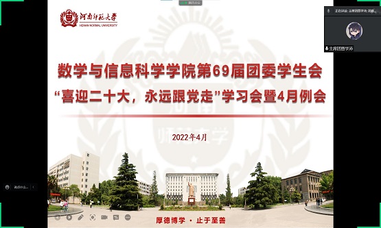 为弘扬伟大建党精神,以实际行动迎接中国共产党第二十次全国代表大会的召开,4月19日,数学与信息科学学院于线上举行第69届团委学生会“喜迎二十大,永远跟党走”学习会暨四月例会,特邀校团委副书记杨上上出席。