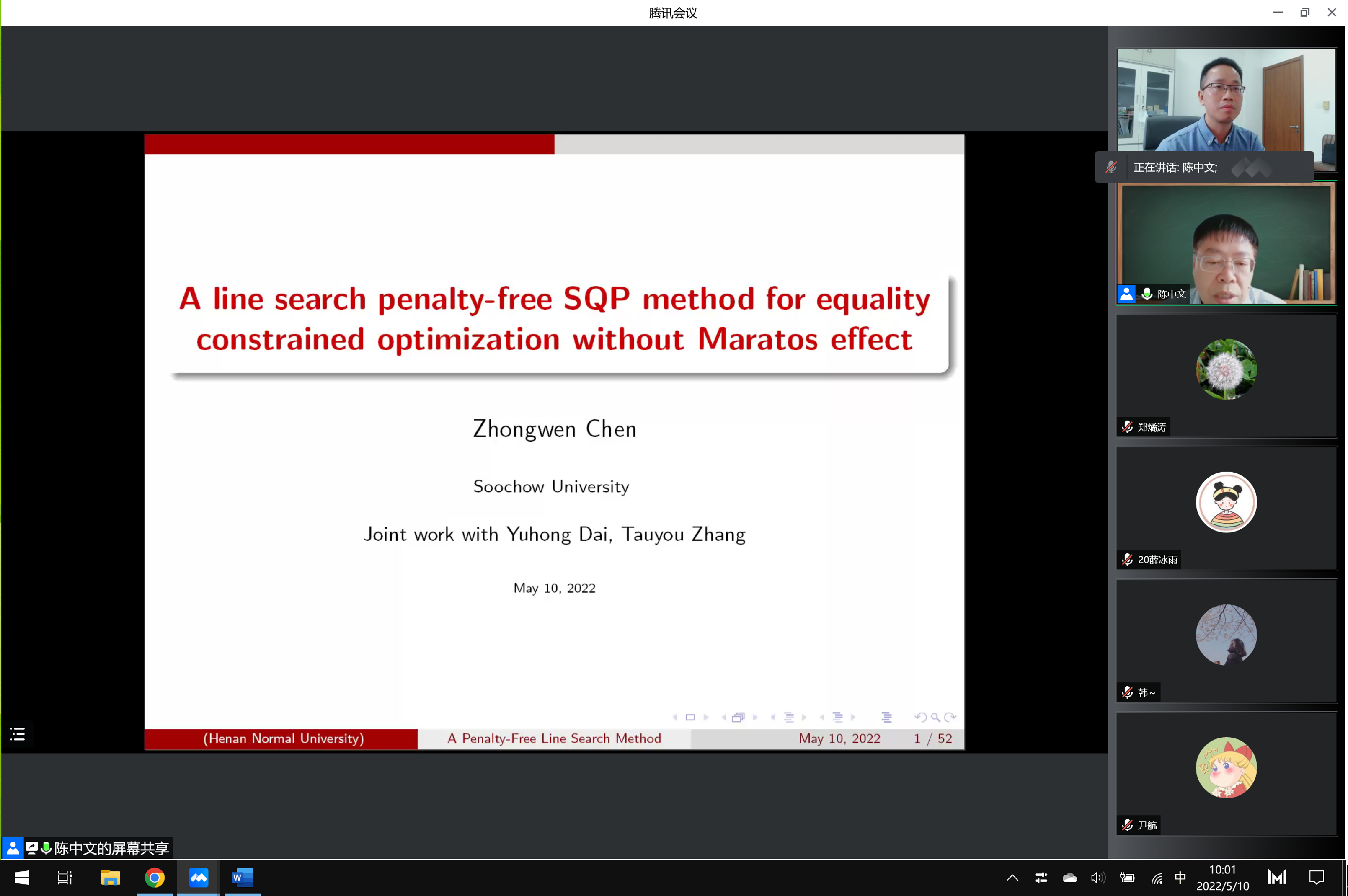 应数学与信息科学学院邀请,苏州大学陈中文教授(博士生导师)于5月10日在腾讯会议平台上作了题为《A line search penalty-free SQP method for equality constrained optimization without Maratos effect》的专题学术讲座。学院相关研究方向青年教师、研究生50余人参加。