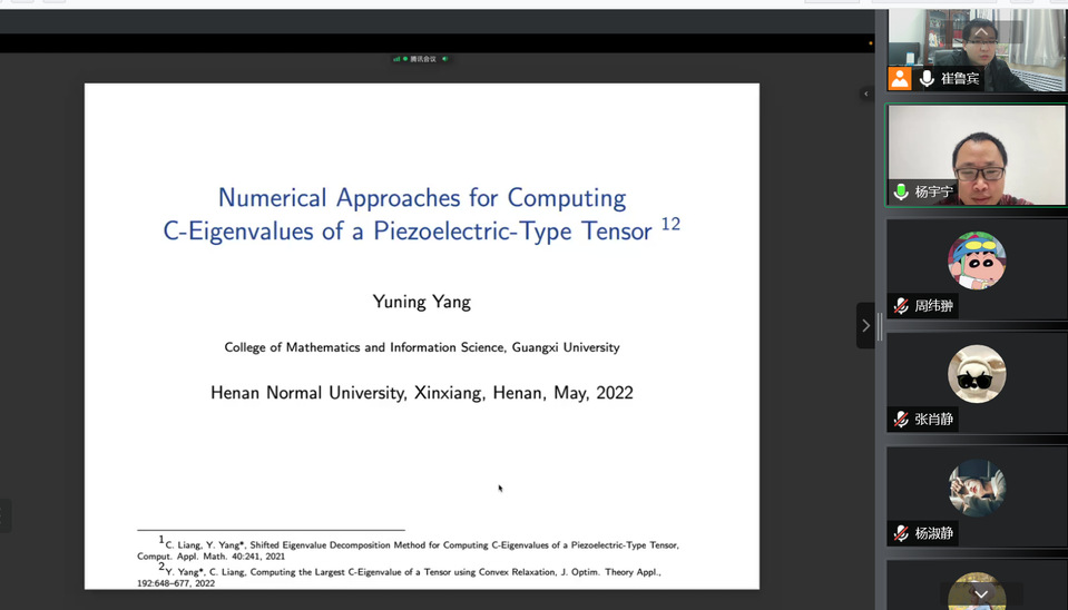 应数学与信息科学学院邀请,广西大学博士生导师杨宇宁教授于5月9日下午在腾讯会议平台上作了题目为《Numerical Approaches for Computing C-Eigenvalues of a Piezoelectric-Type Tensor》的专题学术讲座。学院相关研究方向的青年教师和研究生60余人参加了此次会议。