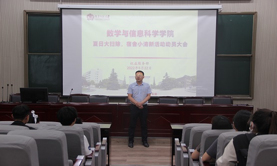 为营造安全、整洁、有序、和谐的宿舍环境,强化宿舍育人功能,展示大学生的精神面貌,5月22日下午,数学与信息科学学院于学院报告厅召开动员大会,院团委负责人高岩锋出席此次会议,团委学生会全体成员、部分班级生活委员以及自律委员参与其中,会议结束后与会成员进行走访宿舍活动。