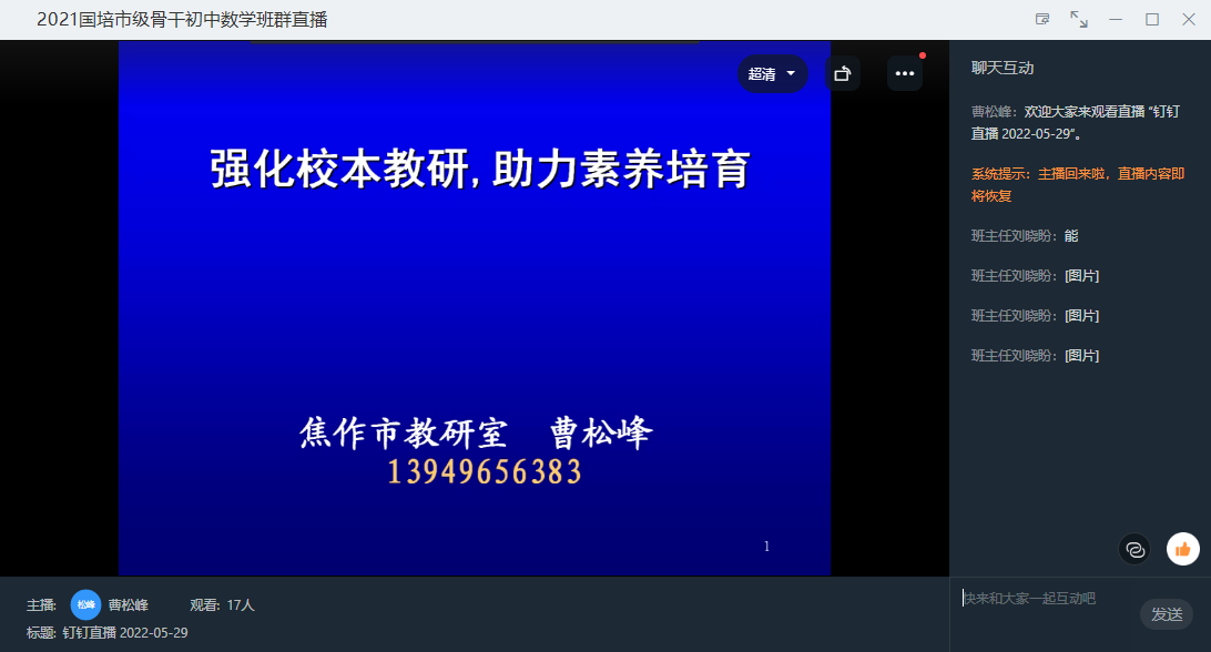 529日上午,全体学员钉钉直播聆听了河南省焦作市基础教育教研室主任曹松峰老师的报告《强化校本教研,助力素养培育》。曹老师首先指出了在“双减”和新课程标准下强化校本教研的重要性。然后具体讲解了校本教研的主要特点、目标、任务、基本途径及主要内容。最后,曹老师用几个生动有趣的数学例题讲解了数学核心素养在校本教研中的体现。