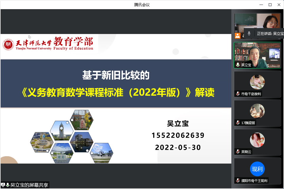 530日下午,天津师范大学吴立宝教授的讲座《义务教育数学课程标准(2022版)》主要内容和变化。吴教授主要讲解了义务教育数学课程标准的修订背景、编排结构、课程性质与理念、课程目标、课程内容、学业质量及课程实施。