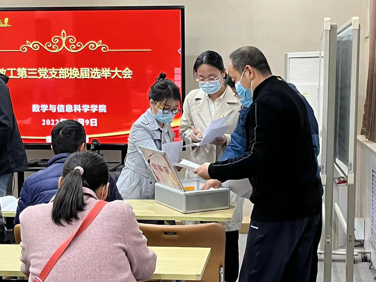 2022年10月9日下午,教工第三党支部在数学南楼103召开党员大会,选举新一届支委会,学院党委委员吴耀武副书记参会。会议由组织委员崔鲁宾主持,共进行5个议程。第一项议程,裴永刚同志汇报本届委员会工作情况,并代表支部委员会述职。第二项议程,通过支部委员会委员候选人名单,第三项议程,通过大会选举办法。第四项议程,通过监票人名单和宣布计票人名单。第五项议程,选举数学与信息科学学院教工第三党支部委员会委员。通过大会选举,最终产生新一届支委:裴永刚,崔鲁宾,李超,并上报上级党委批准。