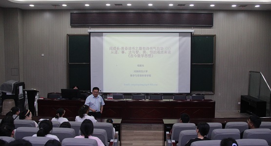 本次青春读书课主要包括四方面:从道、事、法与智、勇、恒的观点来读《古今数学思想》;榜样的力量与自己的路;法——寻道有术;用智、勇、恒装备道、事、法——在健康中勤奋。首先,杨新光老师围绕道、道与科学展开论述,提出道是寻秘之旅这一观点,进而引出对寻道求真大厦的阐述。他认为:宏伟广博、坚忍弘毅是进入寻道求真大厦的关键所在。面对诗歌和远方、高楼与田园时该如何选择也值得深思。其次,他举出数学英雄张益唐和在困难中站起的学术巨擘薛其坤等例揭示偶像的力量对人生之路的重要性,并针对最重要的三个数学思维、现代数学的五大应用和数学学习之法进行详尽讲解,加深学生对寻道有术的理解与认知。同时,杨新光导师表示:“我们要怀有宽心、感恩心、敬畏心与勤奋上进心,在积累中感悟,在健康中勤奋。”最后,他分享苏轼的《观潮—给苏过》与现场学生共勉。本次分享会结束后,参与学子纷纷表示要多读书、好读书、读好书,在浓浓墨香滋润下涵养蓬勃朝气,坚定前行方向。