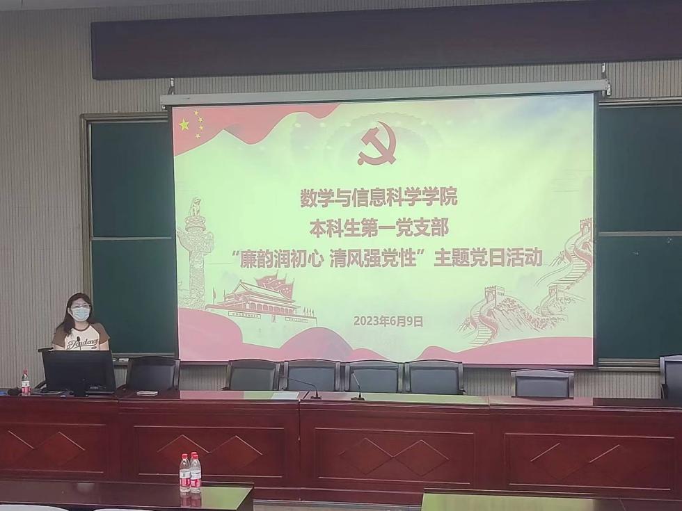 69日,本科生第一党支部在数学院报告厅开展以“廉韵润初心,清风强党性”为主题的党风党纪主题教育活动。本次活动由支部书记毛悦梅领学。