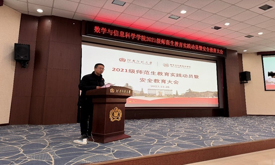 为帮助师范生做好教育实践准备,明确实践注意事项,确保教育实践工作顺利开展,12月28日中午,数学与信息科学学院召开2021级师范生教育实践动员暨安全教育大会。党委副书记王岩、副院长裴永刚出席会议,全体指导教师和2021级在校生参加。会议由2021级辅导员毛悦梅主持。