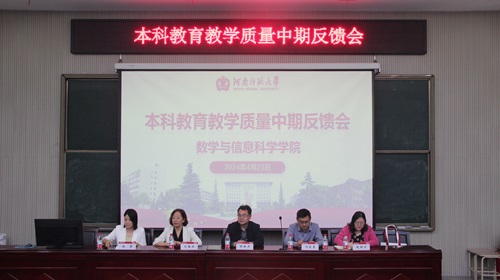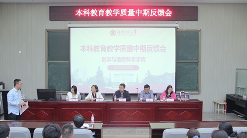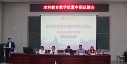 4月23日下午,数学与信息科学学院在报告厅召开本科教育教学质量中期反馈会。校级督导侯新杰、刘春红、闫庆来、赵攀、教务处质量管理科赵换方、学院院长左红亮、学院同行督导、师生代表参加本次会议。会议由副院长裴永刚主持。