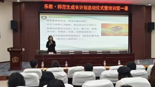 王岩宣读并介绍“乐教”师范生成长计划项目方案。教师代表董乐指出,“乐教”师范生成长计划是对学院学生专业深度的磨砺,更是对其教育理念、教学激情、教学技能以及创新能力的一次全方位检阅。学生代表艾天辰表示,将时刻牢记初心,不断深入学习专业知识,强化教学技能,并呼吁所有参与“乐教”师范生成长计划的同学珍惜机会,提升自己。