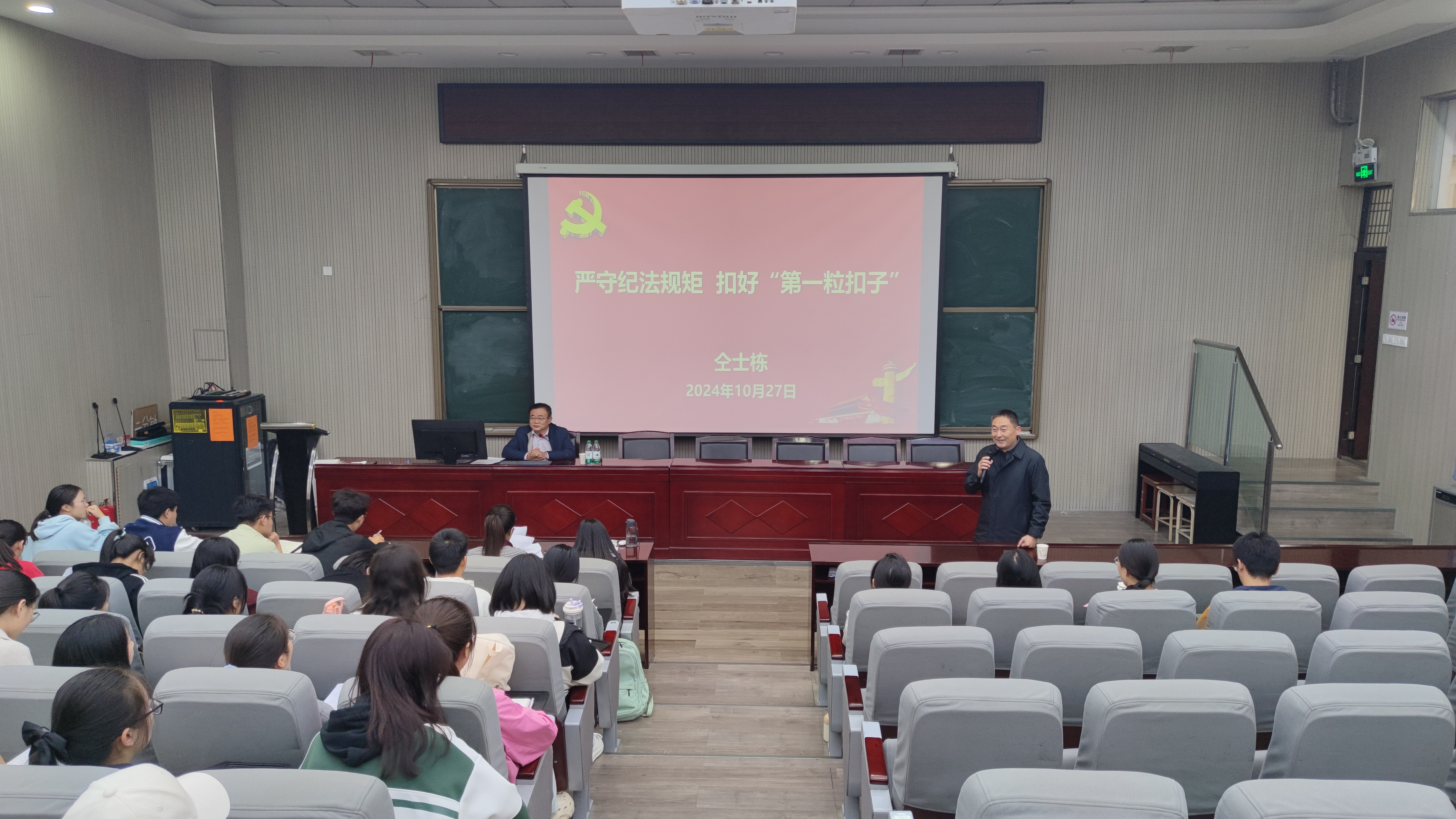 仝士栋以“严守纪法规矩,扣好第一粒扣子”为题,通过违纪违法典型案例,讲清楚党的纪律规矩是什么,引导师生们把遵规守纪刻印在心,内化为言行准则。他详细解读了新时代青年如何扣好人生的第一粒扣子,如何在新时代成为可堪大用、能担重任的栋梁之才,引领师生们学纪、知纪、明纪、守纪,树立正确的价值观。