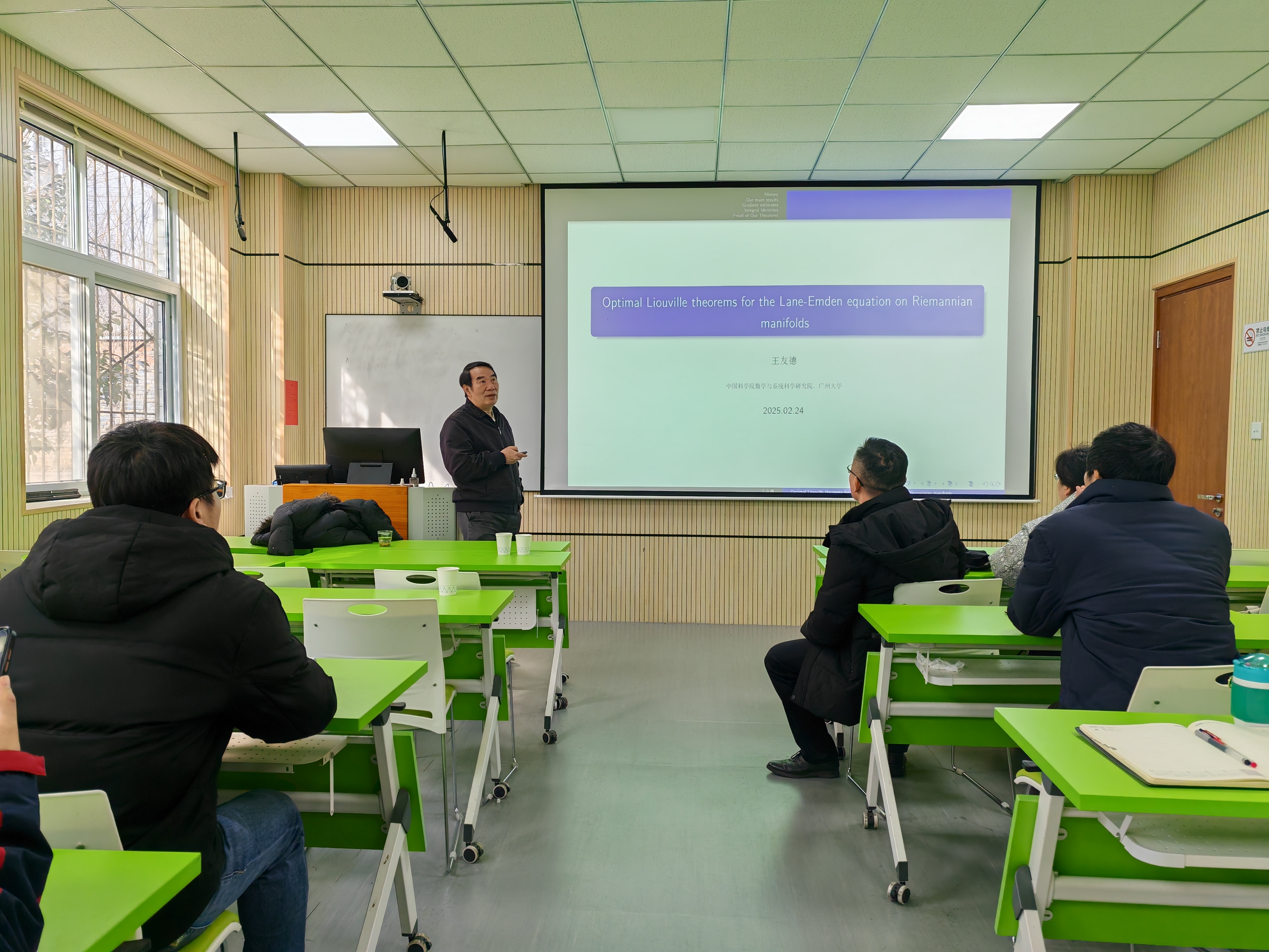 2月24日上午,应数学与统计学院邀请,中国科学院数学与系统科学研究院、广州大学王友徳教授为我院师生作了题为“Optimal Liouville theorems for the Lane-Emden equation on Riemannian manifolds”的学术报告,相关专业教师和硕士、博士研究生参加此次报告,报告由黄广月院长主持。