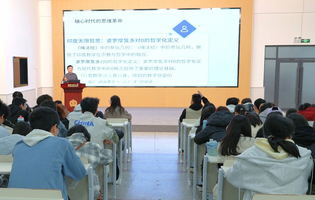 刘锦以“数学文明的奇幻漂流:从远古符号到星辰大海”为题展开讲解。以π为例,他指出数学既是工具,更是哲学,π的无限性引发了有限与无限的哲学思考,正是这种确定性与不确定性的矛盾推动了数学的不断发展。他向同学们介绍了两河流域、尼罗河畔、黄河长江地段数学文明的起源以及后世数学思想的交融,并讲述了认知革命、分析革命、抽象革命、基础革命、数字革命这五次数学革命在数学文明中的批判意义与突破性进步,为在场同学上了一堂精彩的示范课。他鼓励学生不断探索未知、深化理解、创新思维,人生将有无限可能。