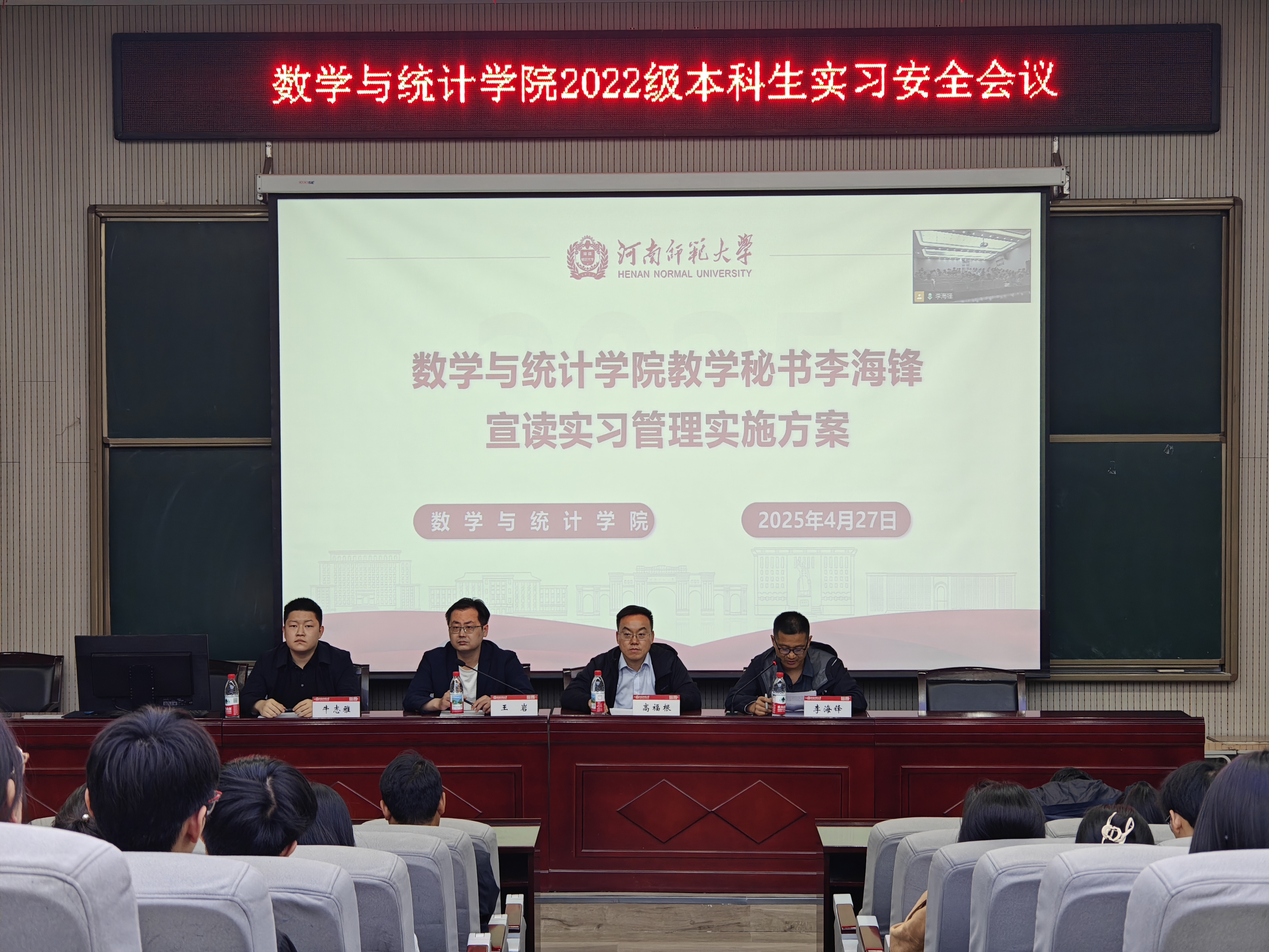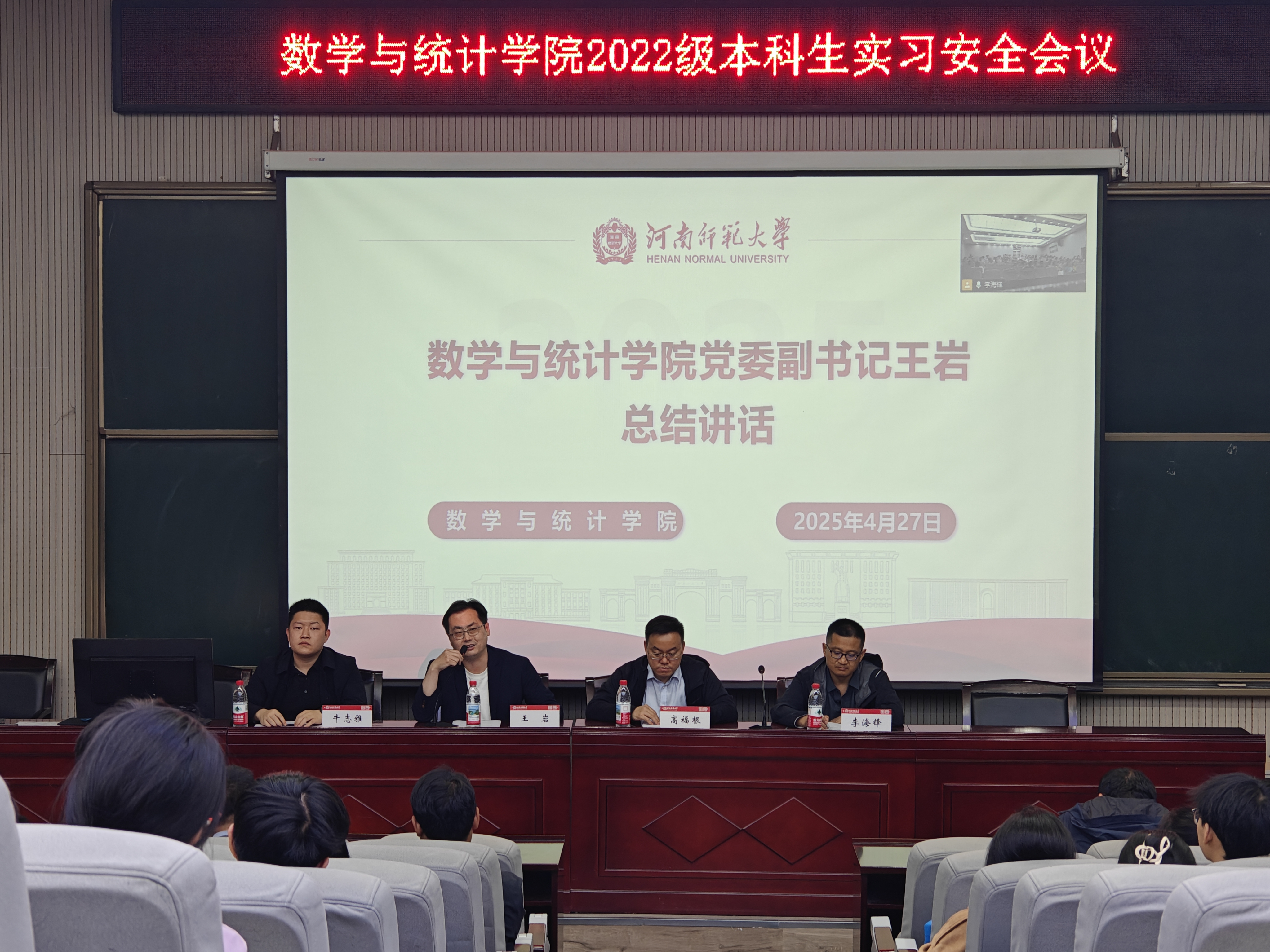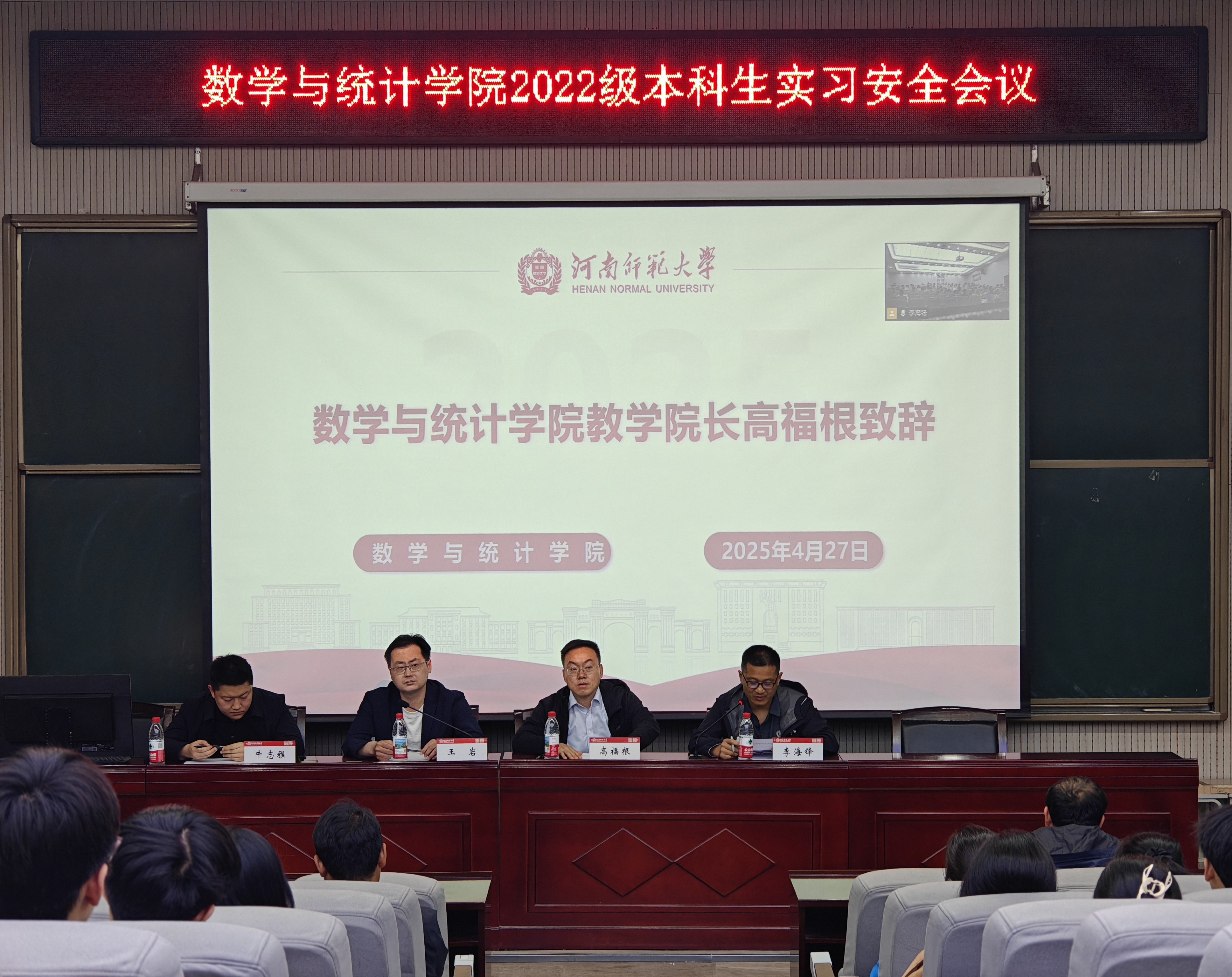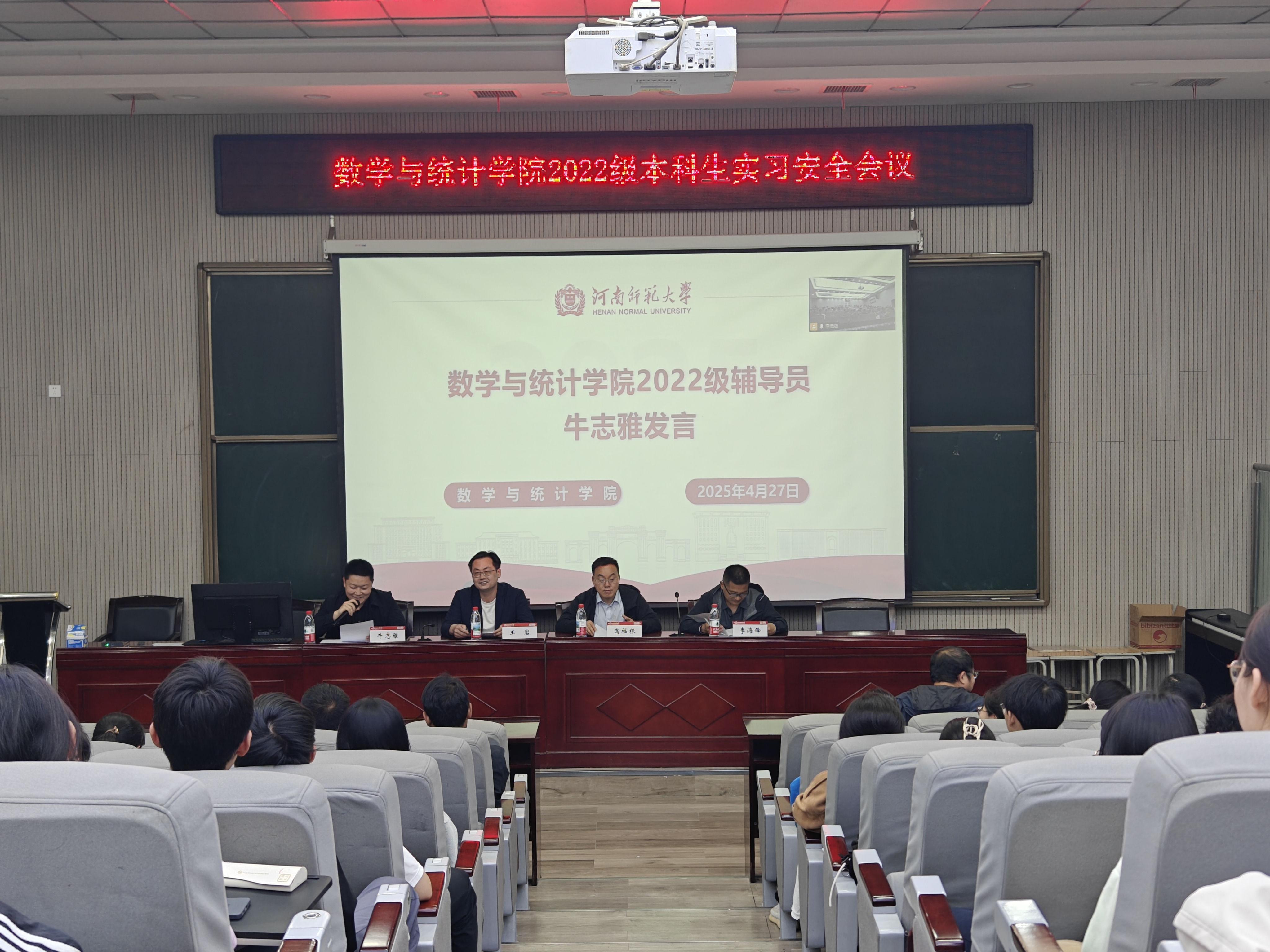 为深入贯彻落实《河南省教育厅办公室关于加强本科高校学生校外实习安全管理工作的提示函》要求,进一步强化学生专业实习安全管理责任,4月27日下午,数学与统计学院在学院报告厅召开2022级本科生实习实践安全管理工作专题会议。学院党委副书记王岩、教学院长高福根、教学秘书李海锋,2022级辅导员牛志雅,校内实习指导老师以及全体实习生共同参会。