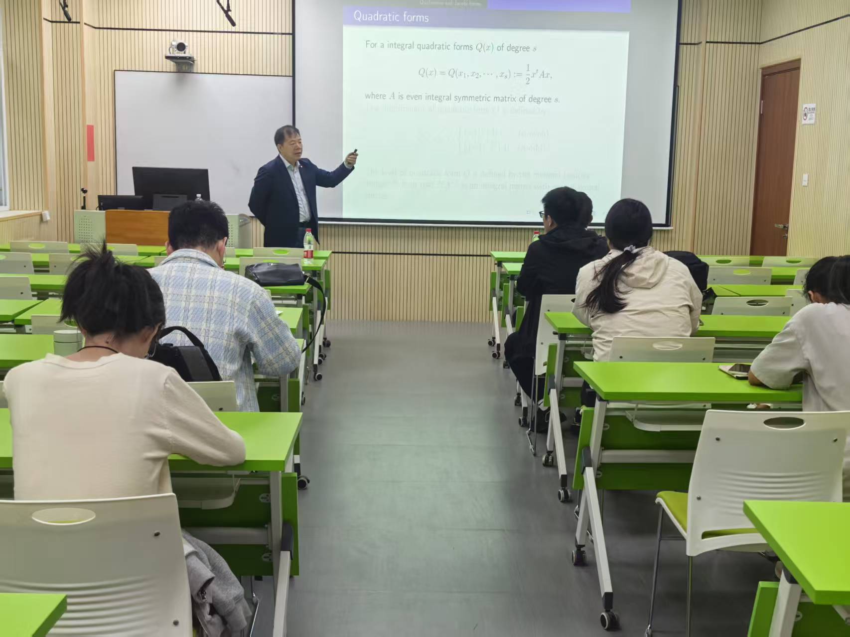 报告中,周海港教授首先从二次型的历史讲起,介绍了其与类数以及模形式之间的内在联系。然后周教授结合目前的研究现状,引入了其在三元二次型分类和表示上的一些结果。例如,得出恰好存在794个类数为1的本原三元二次型,对应于型数(type number)为1的794个Gorenstein四元数序的结论。最后,周教授还阐述了其最近在Jacobi forms方面的进展工作。