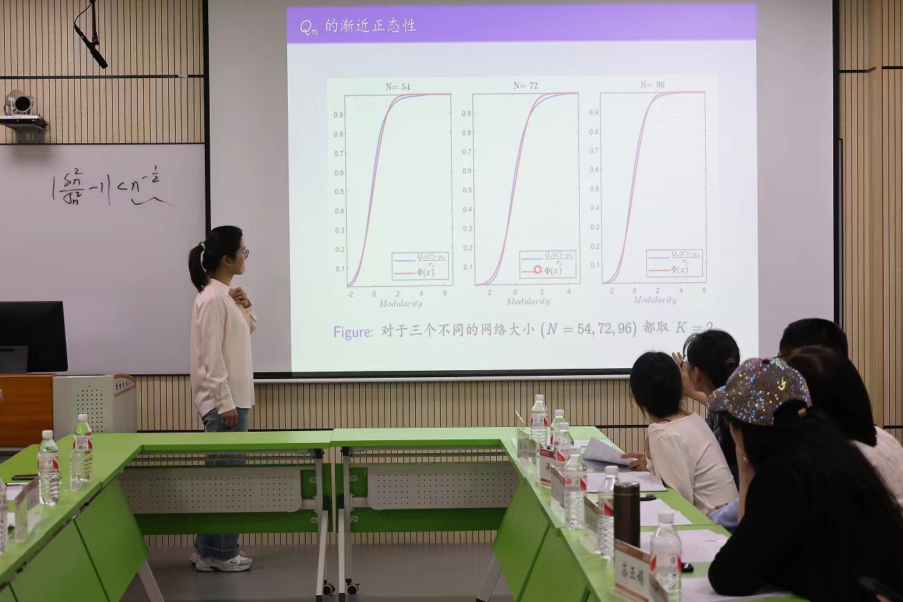 博士生尹晴以《网络中模块化的极限定理》为题做学术报告,从研究背景、主要成果、数值模拟、研究计划、参考文献等五个方面进行详细介绍,系统阐述了网络模块化研究的理论框架与结果。由数学与统计学院徐杰副教授、王珍博士和马欢欢博士组成的点评专家团对论文的选题价值和研究结果给予了充分肯定,并围绕证明过程的严谨性及实际应用展开了深入讨论,为论文的进一步完善提供了重要建议。商学院副院长海本禄教授结合实际问题,就论文成果的模型应用提出了建设性意见,拓展了研究的实践视角。与会师生积极参与讨论,针对论文的理论贡献、方法优化及潜在应用提出了宝贵见解,现场学术氛围浓厚,互动交流热烈。