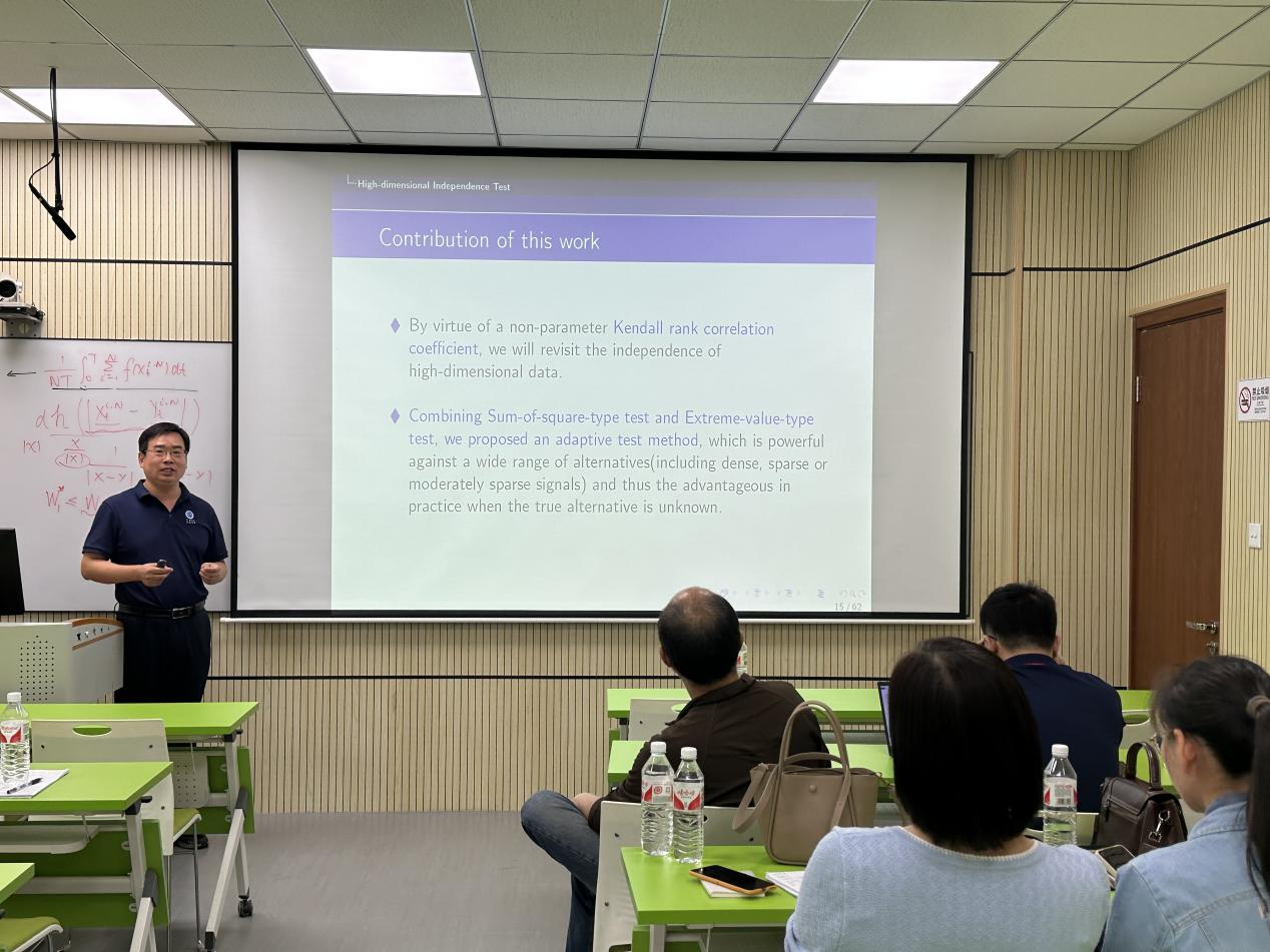 5月10日上午,受数学与统计学院的盛情邀请,河南大学教授在数学楼107会议室作了一场题为“Adaptive test of the independence of high-dimensional data based on Kendall rank correlation coefficient”的专题学术报告。学院相关研究领域的数十名教师和研究生们荟聚一堂,聆听这场内容翔实、观点新颖的学术盛宴。