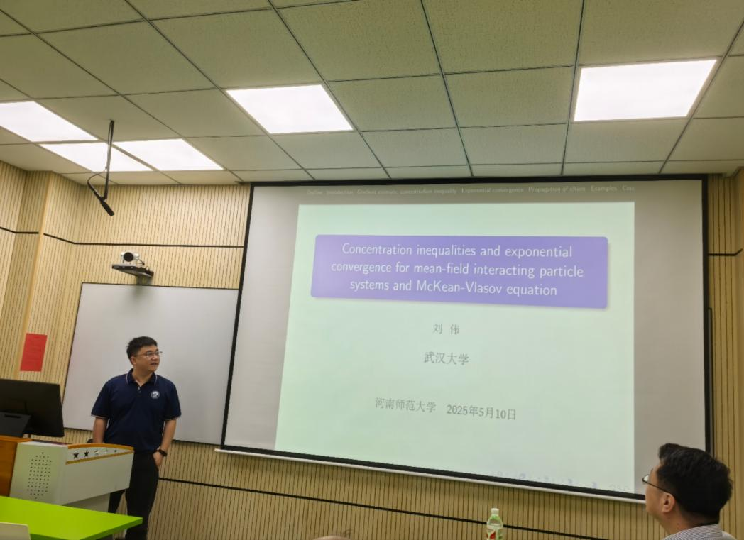 5月10日上午,应数学与统计学院的诚挚邀请,武汉大学刘伟教授在数学楼103会议室精彩呈现了题为“Concentration inequalities and exponential convergence for mean-field weakly interacting particle system and McKean-Vlasov equation”的专题学术报告。数学与统计学院数十名教师及研究生参加了此次报告。