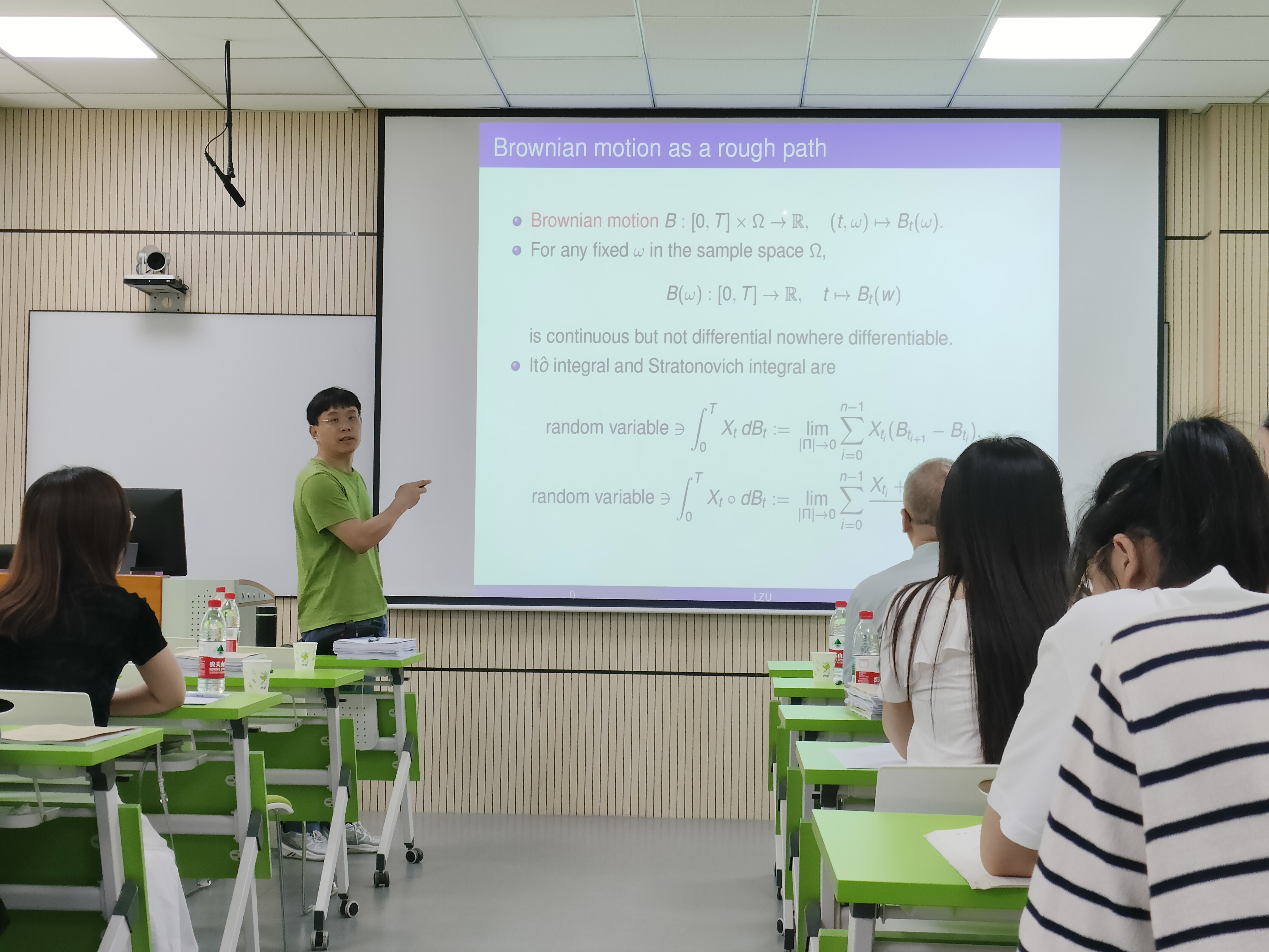 高兴教授对从路径签名理论到更高级的粗糙路径理论和正则结构框架的数学发展历程进行了概述。首先作为路径的坐标系引入了路径签名,通过迭代积分来捕捉路径的本质信息,这自然地引出了粗糙路径理论,从而实现了随机微分方程的顺向方法。随后讨论了正则结构,这是菲尔斯奖得主M. Hairer引入的一个强大框架,用于处理传统的分析工具甚至粗糙路径技术都无法应对的奇异随机偏微分方程。讲座结束后,高兴教授与在场师生进行交流互动,向大家分享了他的科研经历以及培养研究生的宝贵经验,现场气氛热烈,学院师生受益匪浅。