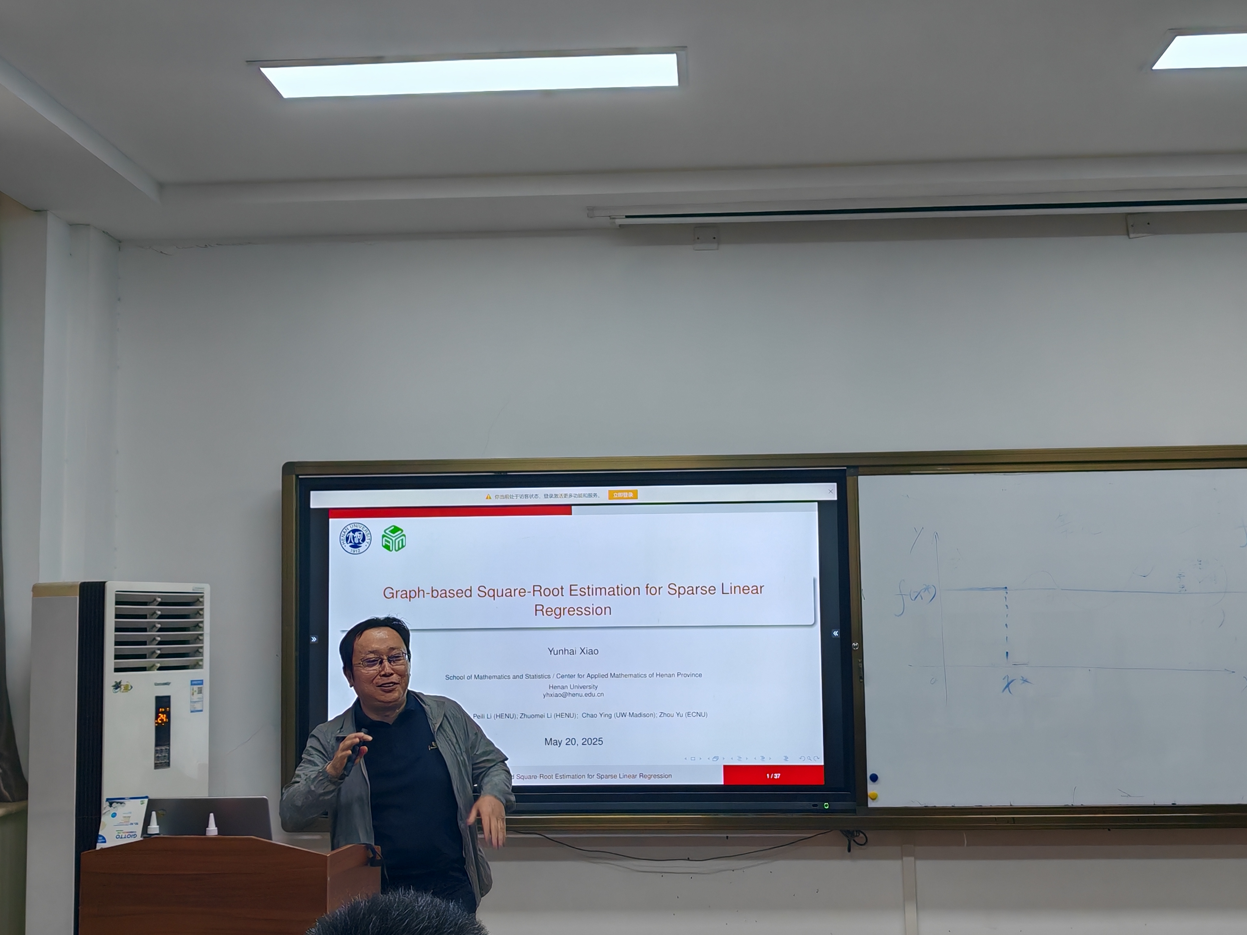 5月20日,应数学与统计学院邀请,河南大学肖运海教授做客“牧野格致”讲堂为学院师生作题为“Graph-based Square-Root Estimation for Sparse Linear Regression”的学术讲座,学院相关研究方向师生参加此次讲座,裴永刚主持。