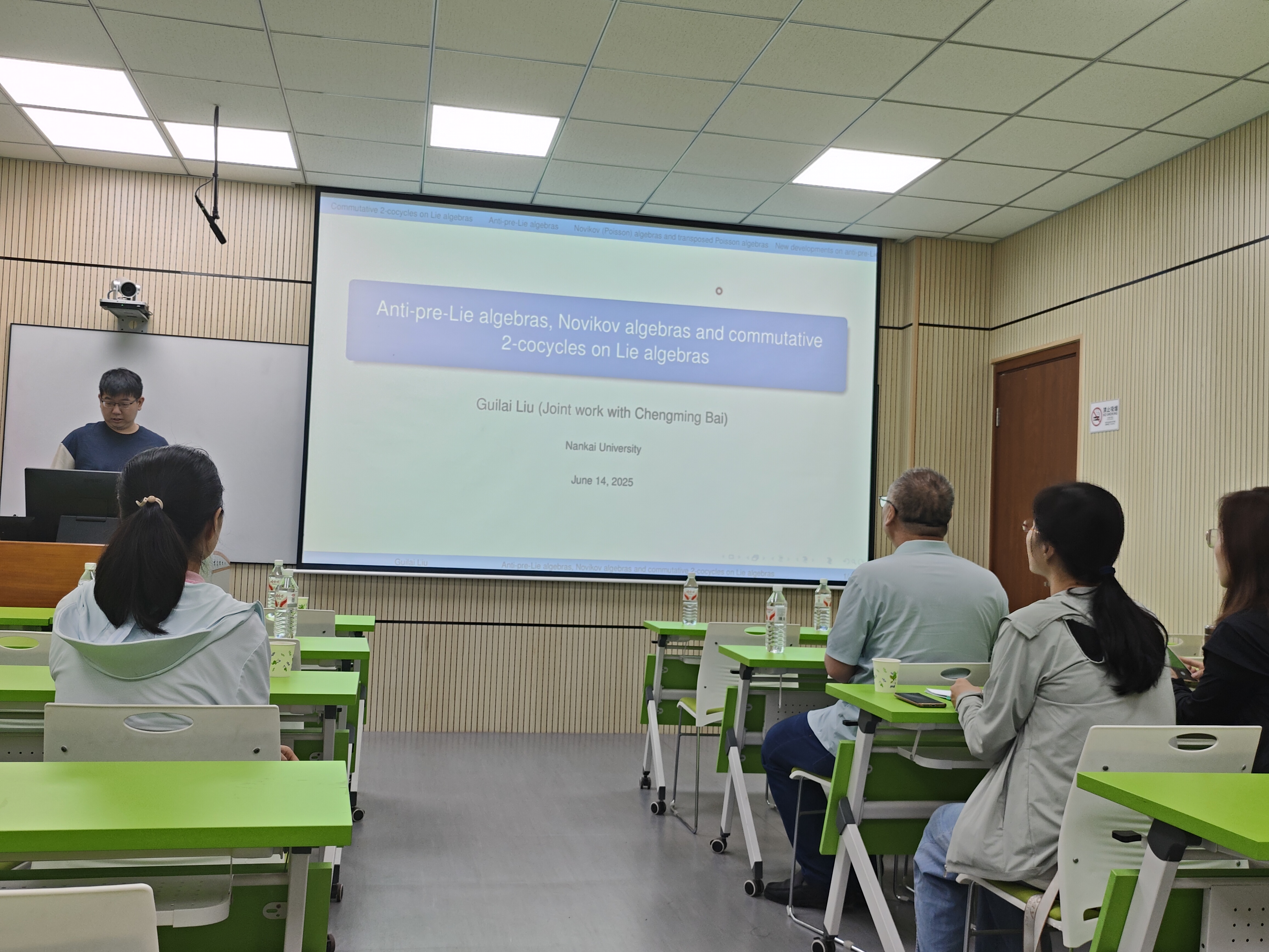 刘贵来老师介绍了anti-pre-Lie 代数的产生背景以及研究现状,介绍了相关性质:如anti-pre-Lie代数可以刻画为负左乘算子给出邻接 Lie代数表示的Lie容许代数、在 anti-pre-Lie代数的邻接 Lie代数的半直积结构上可构造非退化交换 2-上循环、3维单 Lie代数上可构造anti-pre-Lie代数等等。此外刘老师提出了一类可与 Novikov代数以 q-代数的形式相互表出的anti-pre-Lie代数。最后,刘老师给出了anti-pre-Lie Poisson代数与transposed Poisson代数的联系。讲座结束后,刘老师与在场师生进行交流互动,向大家分享了他的科研经历以及学习方法,现场气氛热烈,学院师生受益匪浅。