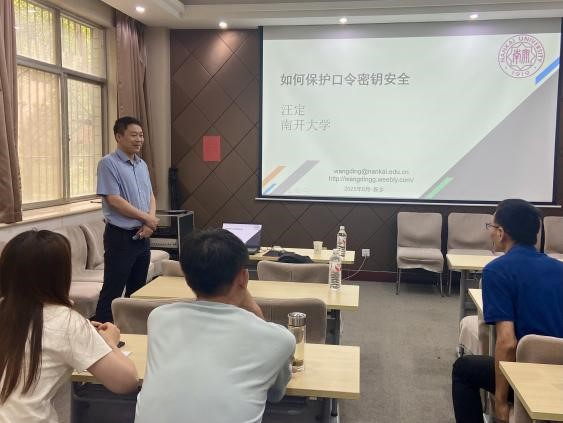 8月14日下午,应数学与统计学院邀请,南开大学汪定教授在数学南楼103室为学院师生作题为 “如何保护口令密钥安全” 的学术报告,学院相关教师和研究生参加了此次报告。此次报告由杜蛟副教授主持。
