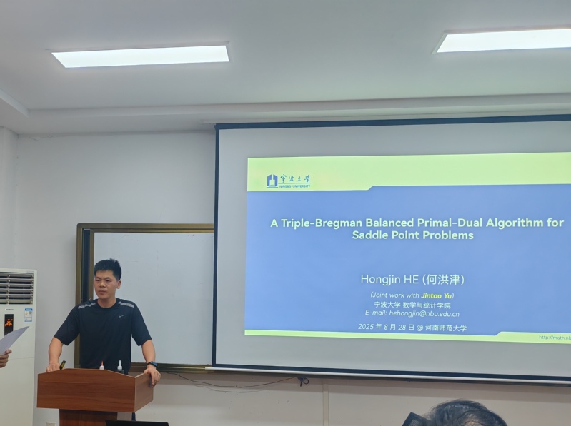 8月28日,应数学与统计学院邀请,宁波大学何洪津教授做客“牧野格致”讲堂,为学院师生作主题为“A Triple-Bregman Balanced Primal-Dual Algorithm for Saddle Point Problems”的学术讲座,学院相关研究方向师生参加了此次讲座,裴永刚主持。