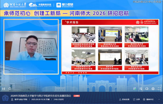 为进一步做好2026年硕士研究生招生工作,提高学院研究生生源质量,并帮助考生充分了解学院研究生教育的整体情况,9月9日上午,学院在数学南楼207召开2026年硕士研究生招生宣讲会,4000余名考生通过中国教育在线-掌上考研宣讲平台参加线上宣讲会活动。