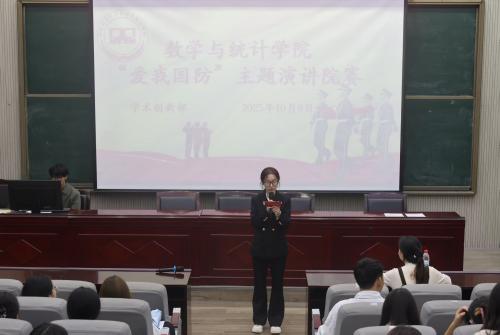 此次比赛以纪念中国人民抗日战争暨世界反法西斯战争胜利80周年为背景,要求选手围绕习近平强军思想、党的二十大和二十届二中、三中全会精神展开演讲,表达对新时代实现中国梦强军梦的理解感悟。比赛过程中,选手们以“抗战精神”核心,用饱满的热情、生动的语言讲述红色故事——有的结合数学先辈在抗战时期坚持科研报国的事迹,诠释“把论文写在祖国大地上”的初心;有的联系自身学习生活,分享如何将抗战精神转化为攻克数学难题、服务社会的动力。他们沉着自信、泰然自若,展现了过人的心理素质与扎实的赛前准备,充分彰显出学院学子朝气蓬勃、昂扬向上的精神风貌。现场观众积极互动,氛围热烈。评委团从主题契合度、语言表达、情感传递等维度对选手们进行综合评审。经激烈角逐,选手夏萌瑶脱颖而出,被推入校赛。