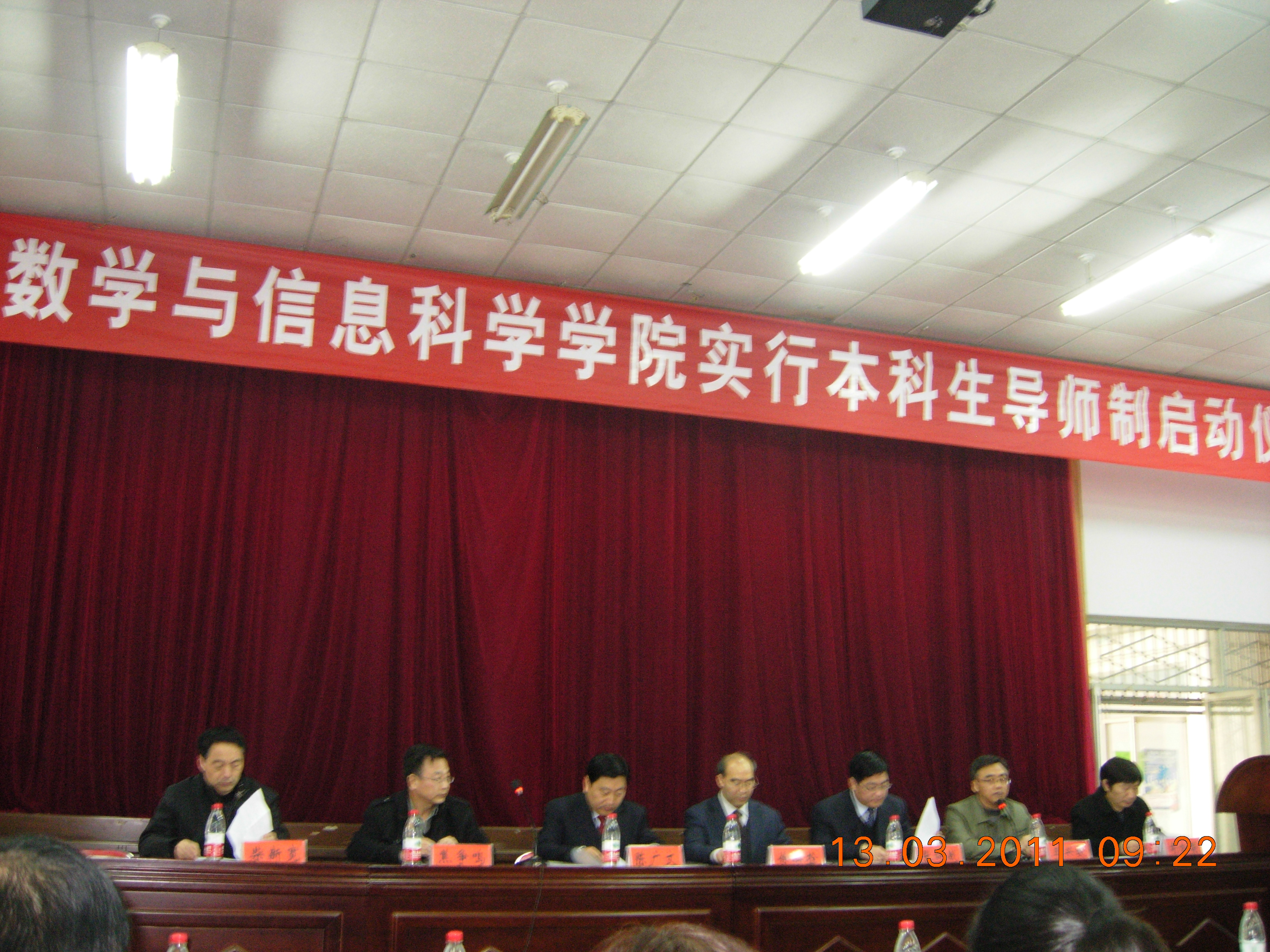 3月13日上午,数学与信息科学学院在学生处多功能报告厅举行本科生导师制启动仪式。我校副校长徐存拴,各相关职能部门负责人和学院领导及全体受聘导师和10级同学参加了此次仪式。仪式由学院院长李兴校主持。 仪式上,院党委副书记胡松振宣读了数学与信息科学学院本科生导师制领导小组名单和《数学与信息科学学院本科生导师制实施方案》。副院长柴新宽宣读了导师名单和学生分组名单,并介绍了与会导师。导师代表 副校长徐存拴首先肯定了数学学院良好的教风、学风、院风,并对本科生导师和与会学生寄予厚望,希望将本科生导师制扎扎实实进行,确保此项体制真正落到实处,发挥实效。 会后,各位导师还与学生进行了第一次面对面的交流。据悉,数学与信息科学学院学院今后还将为每一届新生配备导师。 数学学院实行“大学生导师制”旨在强化教师在教书育人过程中的主体作用,推动师生间教与学的有效互动,实现师生关系的本质回归,构建良好的人才培养环境。该项制度由院党委牵头实施,成立了院党委书记、院长任组长,主管教学工作的副院长,院党委副书记任副组长的工作领导小组。实施方案确定了导师的任职条件和工作职责,制定了导师制工作管理、评估条例以及导师的待遇,要求各位导师要加强对学生的思想引导、专业辅导、生活指导、心理疏导,教育引导,把思想教育与专业教育、课堂教育与课外教育、共性教育与个性教育、严格管理与人格感化结合起来,充分发挥教师教书育人的作用,同时配合辅导员做好大学生思想政治教育工作和管理工作。 (数学与信息科学学院 张瑾 苗山根)