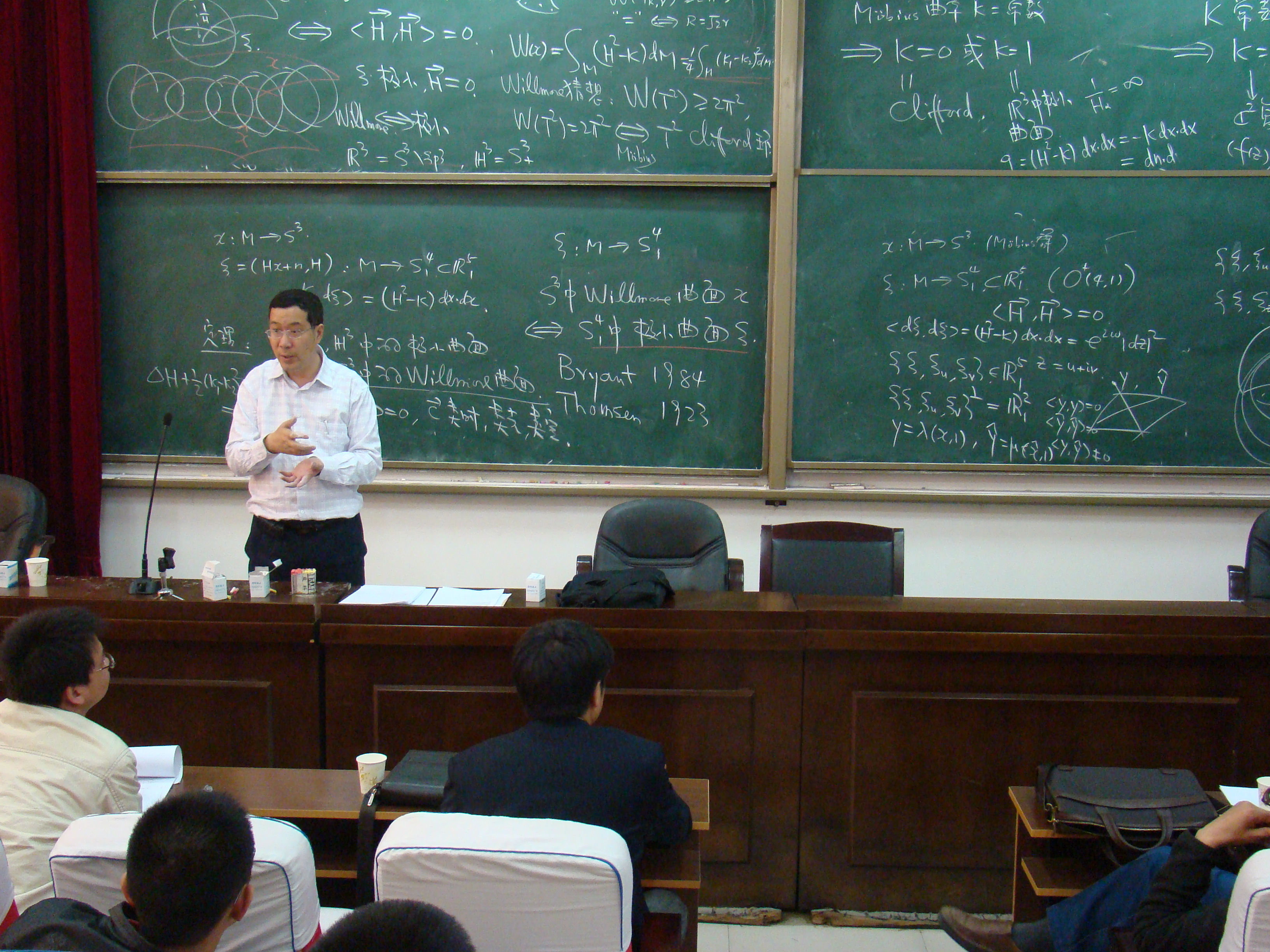 2011年4月18-20日,中国数学学会秘书长、长江学者、杰出青年基金获得者、北京大学数学科学学院院长王长平教授在数学学院报告厅为我校师生做系列学术报告,题目为:Sn中m维定向球面的模空间和Möbius变换群、Sn中子流形的Möbius微分几何、S3中的圆纹Willmore曲面的研究。 王长平教授介绍了Möbius几何的基本概念和一些经典例子,从Möbius变换群讲起,强调了球的反演概念及反演的三个重要性:保球性、保角性、和反定向性。报告中,王长平教授强调研究几何不仅要有很强的数学推理能力还一定要培养空间想象力,这样才能在几何的研究过程中游刃有余。王教授博学、睿智、儒雅,特别是对几何对象的空间想象给师生们留下了深刻的印象,所讲授的内容开拓了学生们的眼界,丰富了学生们对几何知识的认知。 报告结束后,王长平教授、胡泽军教授、李兴校教授与师生们在轻松的氛围中讨论了有关Willmore曲面的经典例子,激发了学生们对几何学的研究兴趣。 |