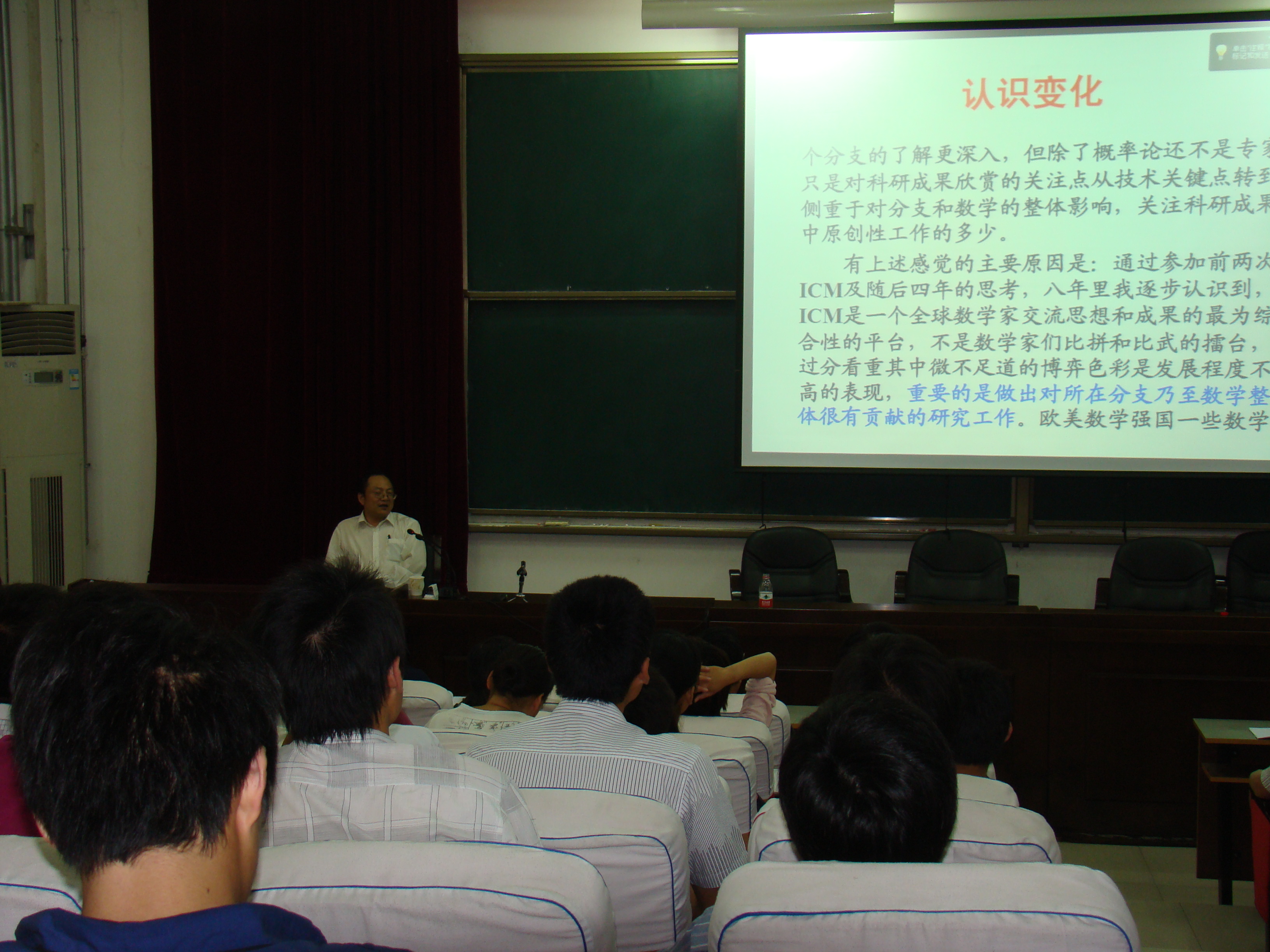 5月30日下午,中国数学会副理事长、中国科学院数学与系统科学研究院应用数学研究所所长、国家杰出青年科学基金获得者巩馥洲教授在数学与信息科学学院多功能报告厅为我校师生作了题为《参加ICM的观感》的精彩报告。学院相关领导、学科教师、研究生及本科生100余人聆听了报告。 巩馥洲教授从2002年参加国际数学家大会(ICM)开始讲起,与大家分享了参加三次国际数学顶级大会的认识与感受。其间,巩馥洲教授介绍了几位菲尔兹奖获得者的工作,并结合自身的奋斗经历,建议同学们打好数学基础,勇于开拓创新;鼓励青年人面对困难要有不服输的拼搏精神,敢于攀登数学高峰。巩馥洲教授饱含激情的演讲,深深感染了在场的每一位听众。 会后,巩馥洲教授与学生进行了亲切交流,并对大家提出了殷切的希望。