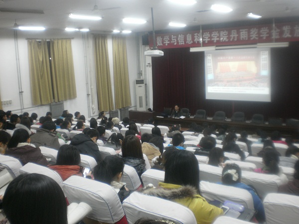 为深入学习宣传贯彻十八大精神, 12月9日晚,数学学院党委书记焦争鸣在院报告厅为全院辅导员和主要学生干部做了十八大精神辅导报告。院党委副书记胡松振主持了报告会。 焦书记用便于记忆的“12345”的方式给大家解读了十八大报告的主要内容和精神实质。通过对我们党举什么旗帜、走什么道路、保持什么样的精神状态、朝着什么样的目标前进等重大问题的讲解,使大家对十八大报告主题有了深刻的认识;通过对十八大两大贡献的分析,使大家对科学发展观的认识有了进一步的提高,对新的党中央领导集体充满了信心;通过对中国特色社会主义道路、中国特色社会主义理论体系、中国特色社会主义制度三大成就的解读,使大家对夺取中国特色社会主义新胜利充满自信;通过对贯彻落实科学发展观必须更加坚持四个自觉新要求的阐述,使大家更加深刻地认识到科学发展观对坚持和发展中国特色社会主义的重大现实意义和深远历史意义;通过对经济建设、政治建设、文化建设、社会建设、生态文明建设五位一体总布局的分析,使大家对全面建成小康社会和全面深化改革开放的目标有了更加清晰的认识。最后,焦书记要求学生要在看展览、听报告、学党章的基础上,继续深入研读党的十八大文件,原原本本学习党的十八大报告和党章,学深学透,同时做好宣讲工作。焦书记报告结合实际,深入浅出,通俗易懂,博得了同学们的阵阵掌声。 胡书记在总结时指出,学习十八大是现阶段一项重要的政治任务,学院学生党员和干部,第一要率先带头学习宣传党的十八大精神,通过加强理论学习来提高工作水平和能力;第二要坚定理想信念,对国家和中华民族的伟大复兴及未来充满信心;第三十八大报告为当代大学生描绘了美好的蓝图,同学们应该利用学校的资源优势刻苦学习,脚踏实地,立志成才。 (数学与信息科学学院 苗山根) |