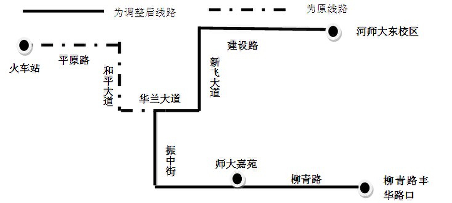 各位老师: 接新乡市公共交通总公司通知:由于新乡市机动车辆激增,城市道路拥堵严重,为响应市委、市政府关于改善城市综合交通的指示精神,公共交通公司拟于11月1日起将原41路车线路撤销,原801路线路进行调整。具体情况如下: 801路由河师大发车原线路不变,行驶至华兰大道振中街口向南行,贯穿振中街,途经南环师大嘉苑,终点是柳青路丰华路口,调整后的发车时间为: 早班车:河师大发车 6:00 师大嘉苑发车 6:30 末班车:河师大发车 19:50 师大嘉苑发车 20:30 班车间隔时间为:8—10分钟。