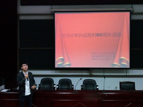 为大力弘扬长征精神,使同学们更加深刻地了解和铭记这段历史,增强民族凝聚力和爱国之情。2016年10月16日,数学与信息科学学院研究生党支部举办了纪念红军长征胜利80周年的主题活动,晚上七点半活动正式开始。研二班长洪国庆同志发表讲话,内容突出红军长征的意义和弘扬红军长征的精神。 活动以放映电影的形式进行,影片主要讲述了中国工农红军为了躲避国民党反动派的打击,进行战略大转移的故事。以参加过长征红军老战士的回忆为线索,生动的展现了红军长征过程中的各种经历,毛主席带领红军,为了摆脱敌人的追击,四渡赤水,强渡大渡河、飞夺泸定桥、爬雪山过草地,终甩开了敌人。影片充分反映了长征时期的艰辛和红军战士一往无前、不怕牺牲的英雄气概。 通过观看影片,红军长征“不怕牺牲、前赴后继,勇往直前、坚韧不拔,众志成城、团结互助,百折不挠、克服困难”的精神感动、感慨、感悟之情印记在每个人的心里,不忘初心,继续前进。让我们牢记历史,缅怀先烈,承前启后,继往开来,把握当下,立志报国,为祖国的明天再谱新篇。 数学院 苗山根 王聪涵 |