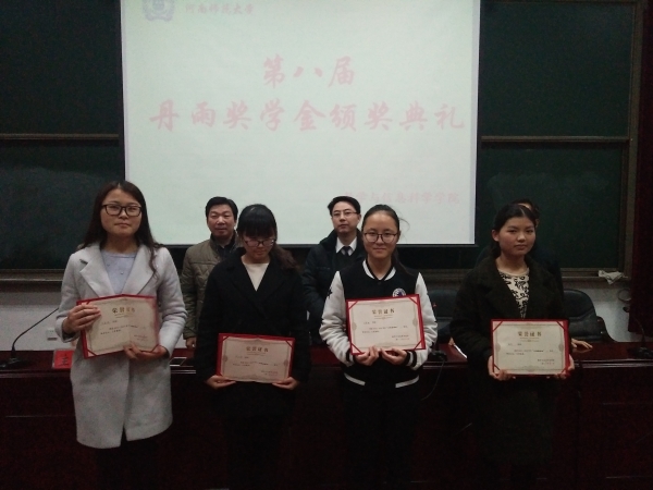 11月29日晚,数学与信息科学学院于院多功能报告厅举行第八届“丹雨奖学金”颁奖典礼。数学学院89级毕业生、丹雨奖学金出资人谷永春的代表王文喜,数学与信息科学学院党委书记刘文安,副院长黄广月出席此次会议。会议由副书记李富杰主持。 颁奖典礼上,副院长黄广月宣读了“丹雨奖学金”评选说明。2015至2016年度评选出刘嘉敏、黄玉婷、周春燕、陶莹四位同学分别获得一等奖和二等奖。随后,领导老师向获奖者颁发荣誉证书,并对获奖同学表示热烈祝贺。随后,获奖同学代表黄玉婷讲述了个人学习经验,希望全体同学积极行动起来,制定计划,养成良好学习习惯,不断挖掘自身潜力,争取取得更大进步。 最后,刘文安书记做重要讲话。首先详细介绍了丹雨奖学金的设立背景,并讲述了“丹雨奖学金”设立的重要意义,对学院教育事业的发展和学生综合素质的提升发挥了积极作用。然后,刘文安书记对在座同学在今后的学习和工作上提出殷切的希望,希望同学们无论在科学知识、师范技能、工作能力等方面争取更多地锻炼,勉励各位学生努力学习,不断进取,并要求学生要注重个人高尚品德的修养,不负师大“厚德博学,止于至善”的校训,要增强社会责任感、使命感,戒骄戒躁,刻苦钻研,努力加强道德修养,继续树立远大理想,不断提高自身综合素质,回报亲人,母校的培育,为我院的振兴做出不懈努力。 颁奖典礼结束后,获奖学生与到会领导和老师合影留念。 (数学与信息科学学院吴小林 顾茜茜) |