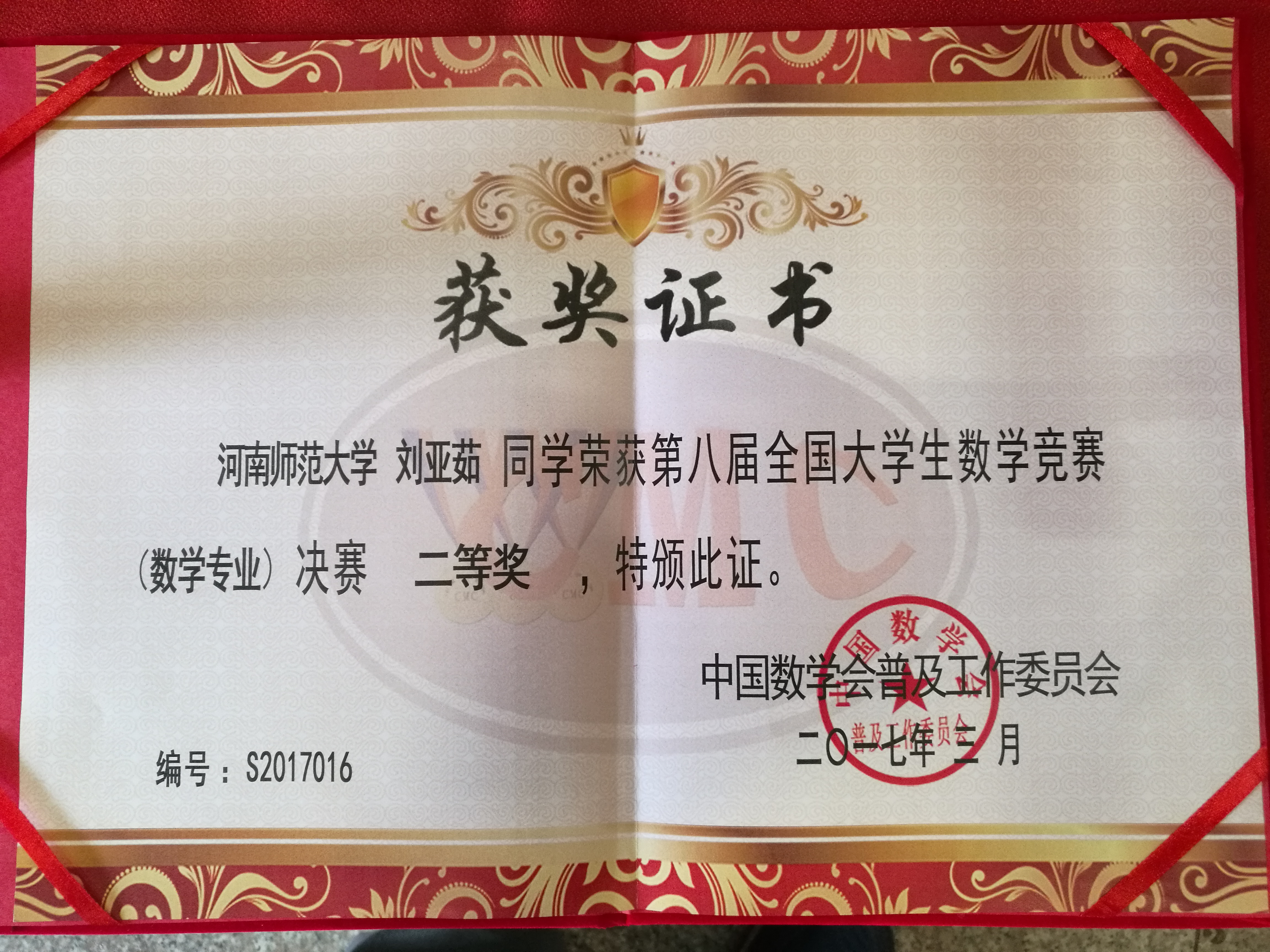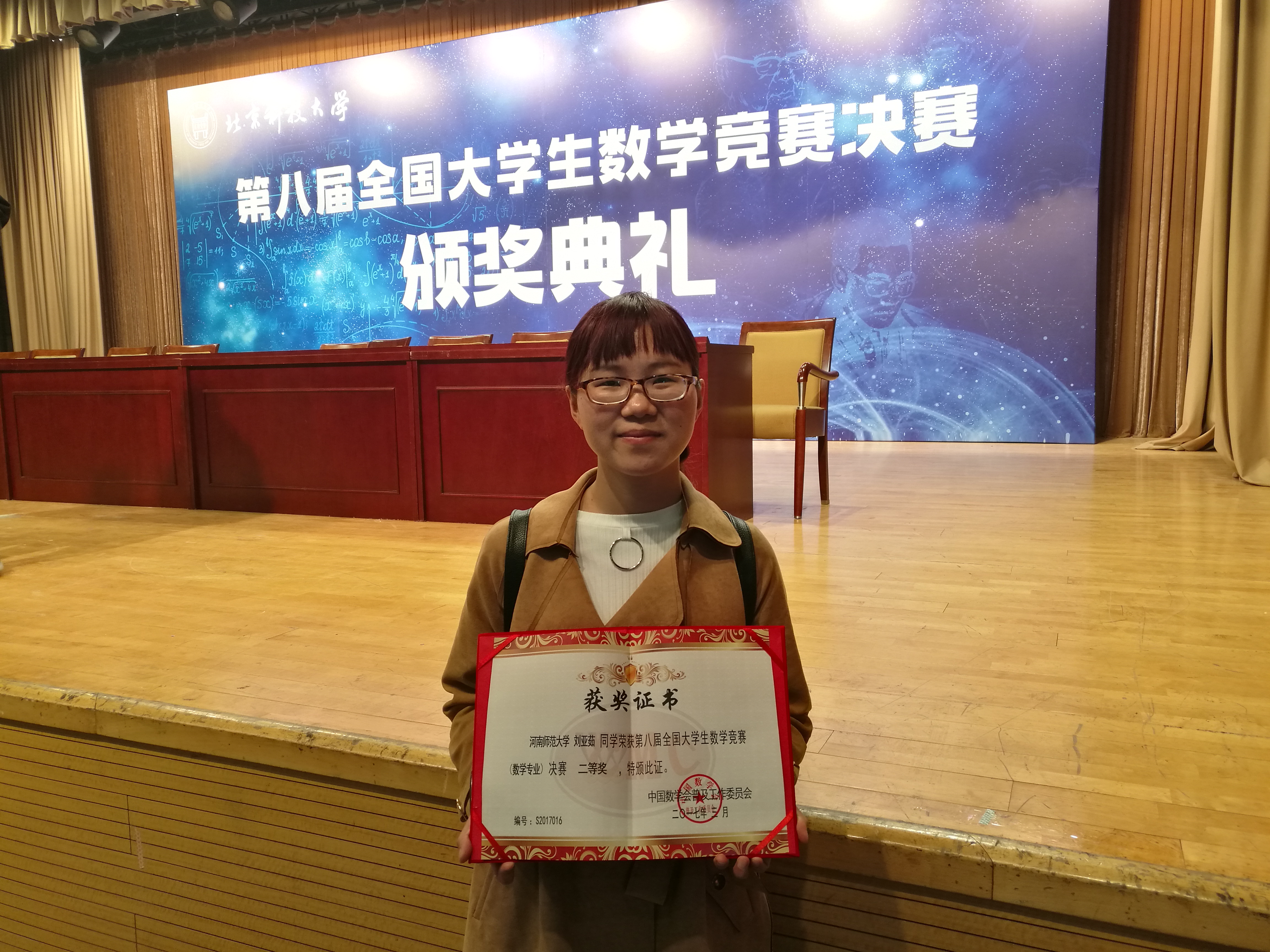获奖证书 2017年3月17日——19日,“第八届全国大学生数学竞赛”决赛在北京科技大学举行,闯入全国“数学专业组”决赛的我院2013级信息与计算科学专业学生刘亚茹不负众望,以优异的成绩获得二等奖第一名,全国第16名。 “全国大学生数学竞赛”是由中国数学会普及工作委员会主办的一项具有较大影响力的全国性数学竞赛,旨在培养人才、服务教学、促进高等学校数学课程的改革和建设,增加大学生学习数学的兴趣,培养分析、解决问题的能力,发现和选拔数学创新人才。取得全国一等奖的大学三年级参赛学生有机会提前获得北京大学等名校的推免面试资格。 本届全国大学生数学竞赛于2016年10月在全国28个赛区举行预赛,参赛人数达85797人,覆盖全国数百所大学。经过选拔,共有283人晋级决赛,其中数学专业组94人,非数学专业组189人。数学专业组决赛试题涵盖了数学分析、高等代数、解析几何、实变函数、复变函数、抽象代数、数值分析、微分几何、概率论等九门数学专业课程内容,并且决赛试题难度很大,参加决赛的考生中不乏清华大学、北京大学等著名高校学生,想突出重围取得优异成绩非常困难。 我院学生在竞赛决赛中取得佳绩,证明了学院在教学方面的整体实力和学生的数学水平,并为学校“十三五”规划建设和“双一流”建设书写了浓墨重彩的一笔。