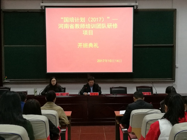 10月14日上午,“国培计划(2017)”——河南省教师培训团队研修项目小学、初中数学班开班典礼在数学与信息科学学院报告厅举行。学院党委书记刘文安、主管副院长张瑾及学科班主任、生活班主任参加开班典礼,典礼由副院长张瑾主持。