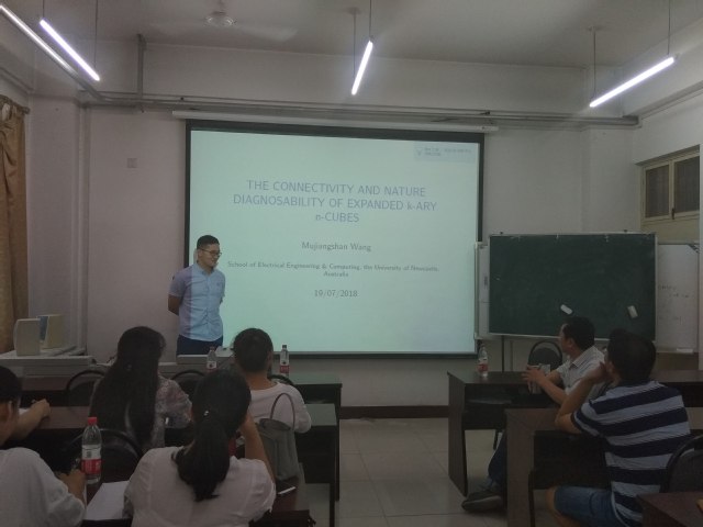 7月19日下午,应数学与信息科学学院邀请,澳大利亚纽卡斯尔大学(The University of Newcastle)Mujiangshan Wang在数学楼107报告厅作了一场题为“The connectivity and nature diagnosability of expanded k-ary n-cubes”的学术报告。报告会由校特聘教授王世英主持,学院相关专业青年教师、博士研究生、硕士研究生参加了此次报告会。 Mujiangshan Wang就自然连通度及诊断度的提出做了简明扼要的介绍,并通过凯莱图的介绍引入扩充K元N方体。连通度和诊断度是研究互连网络的热点问题之一。他首先介绍了扩充K元N方体等基本概念,并详细讲解了PMC模型和MM*模型下扩充K元N方体的自然连通度及诊断度。会后,师生们讨论热烈,王世英教授就当前该领域的研究做了总结发言并结合此报告指出了一些具体的研究方向。本次报告会开拓了与会师生的视野,也极大的鼓舞了我院研究生的科研热情。 (数学与信息科学学院 王贞化) |