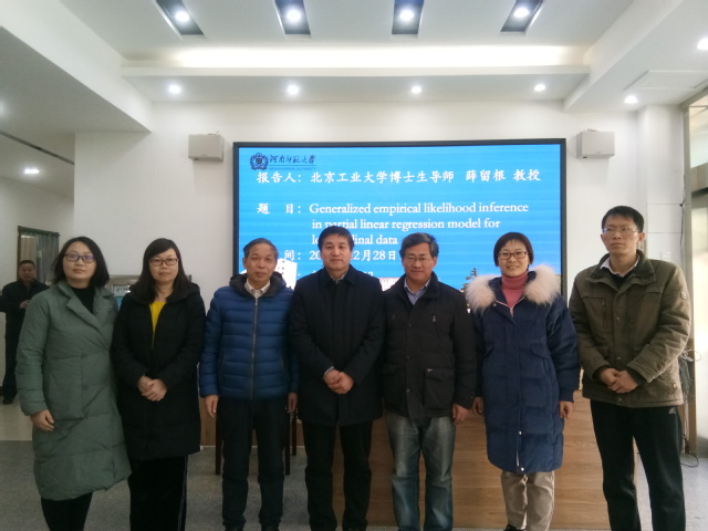 12月28日下午,应数学与信息科学学院邀请,北京工业大学博士生导师薛留根教授和程维虎教授在数学南楼103分别做了题为“纵向数据下部分线性模型的广义经验似然推断”和“基于次序统计量的统计推断理论与方法”的学术报告。报告会由庞善起副院长主持,我院相关师生到场聆听了此次讲座。 薛留根教授首先介绍了常见的现代统计模型和复杂数据,然后介绍了纵向数据下部分线性模型的估计问题,基于二次推断函数和经验似然方法给出了参数分量和非参数分量的估计及其大样本性质,并通过统计模拟和实际数据验证了经验似然方法的优势。 程维虎教授深入浅出地介绍了样本次序统计量及其分布、次序统计量矩的计算、次序统计量之差矩的计算,并介绍了几种基于次序统计量的统计推断理论和方法,讨论了统计量的性质,最后给出几类特殊分布的基于样本次序统计量的总体分布的统计推断新方法。 两位教授的报告内容前沿新颖,讲解幽默风趣,拓宽了师生们的学科视野,加深了对现代统计发展前沿的认识。