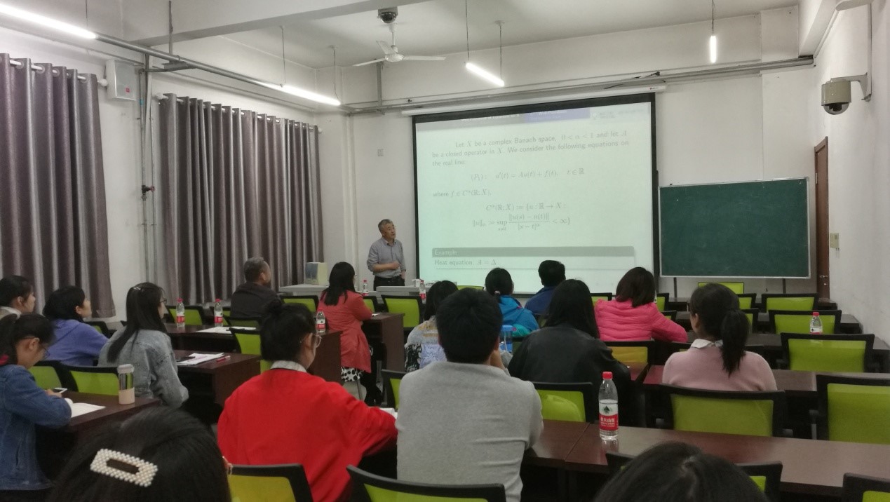 应数学与信息科学学院邀请,清华大学博士生导师步尚全教授到我校进行学术访问,并于4月19日下午在数学楼107作了题为“Well-Posedness of vector-valued degenerate differential equations”的学术讲座,数学学院教师、研究生和本科生50余人聆听了本次讲座。讲座由数学学院副院长高福根主持。 步尚全教授首先介绍了实数空间中一阶和二阶微分方程的适定性问题及退化的一阶和二阶微分方程的适定性问题;其次介绍了一阶和二阶微分方程的周期适定性问题,对于二阶退化微分方程,给出了在具体的Banach空间中预解集算子的概念,最后化为乘子定理来讨论相应方程的适定性。 讲座结束后,步尚全教授又与老师们就研究中遇到的具体问题展开了深入的讨论。