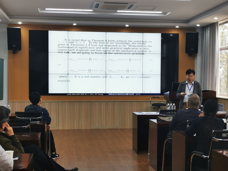 11月16日,应数学与信息科学学院的邀请,华南师范大学数学科学学院院长、博士生导师黎稳教授在我校数学北楼506大数据实验室作了“On the determinant and trace optimization problems with applications”的学术讲座。相关专业的老师、研究生、本科生等共30余人参加了讲座。讲座由数学与信息科学学院院长苗雨教授主持。 黎稳教授提出了约束优化问题的重要性,给出了两个数值问题的解析解与对矩阵广义特征值的新估计。特别是给出了矩阵极值化的新实例,证明其提出的理论结果的有效性。黎稳教授的报告,简明清晰,详细的讲解了矩阵广义奇异值的上下界问题,拓宽了学生们的知识面,引起了在场专家的热烈讨论。