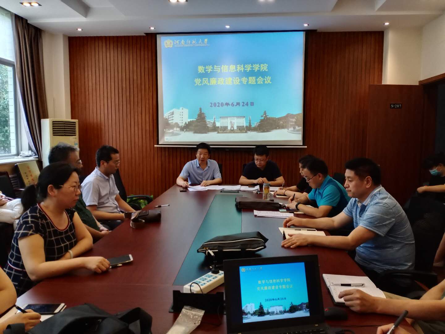 6月24日下午,数学与信息科学学院在数学楼207会议室召开党风廉政建设专题会议。数学学院领导班子及全体科级干部参加此次会议。会议由学院党委书记刘文安主持。 会上,刘文安领学了学校2020年度纪检监察工作要点,讲解了党风廉政建设责任书的新变化和新要求,安排部署了学院2020年度党风廉政建设工作,并对科级以上领导干部进行集体廉政谈话。与会人员还集中学习了学校基层党委意识形态工作责任制考核指标的具体内容。集体廉政谈话中,刘文安提出三点要求,一要旗帜鲜明讲政治,严守纪律规矩,自觉增强政治意识,提高政治能力,恪守政治纪律;二要加强对党的理论知识和业务知识的学习,要知廉、学廉、守廉,做廉洁自律的表率;三是要贯彻落实意识形态工作责任制和网络意识形态工作责任制,贯彻落实民族宗教政策,增强意识形态工作领导权和话语权,确保学院意识形态领域安全。 会上,学院正职院领导与副职院领导、分管院领导与科级干部逐一签订了党风廉政建设责任书。 (数学与信息科学学院 苗山根) |