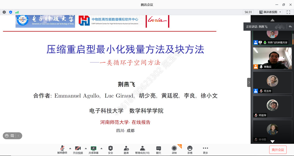 12月9日,应数学与信息科学学院的邀请,电子科技大学荆燕飞教授在线上会议为我院师生作了“Krylov子空间方法:认识、理解、应用”的学术会议。伟德官网下载苹果版的相关专业教师、研究生、本科生等共三十余人参加了线上会议。会议由数学与信息科学学院崔鲁宾老师主持。 荆燕飞教授介绍了Krylov子空间方法,并针对大规模线性代数方程组求解问题,从投影方法理论基础、典型方法设计思想方面,对Krylov子空间进行了讲解,重点阐述一类循环谱特征信息的广义最小残量方法及其块方法。荆燕飞教授的报告内容丰富翔实,深入浅出,观点新颖,启发性强,为同学们今后的科研工作和未来发展提供了深刻的借鉴意义。
