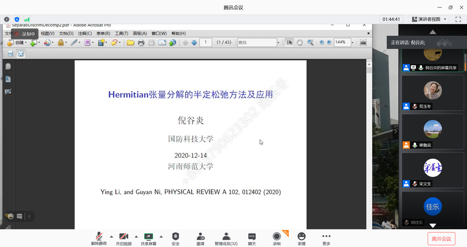 12月14日,应数学与信息科学学院的邀请,国防科技大学倪谷炎教授在线上会议为我院师生作了“Hermitian张量分解的半定松弛方法及应用”的学术会议。伟德官网下载苹果版的相关专业教师、研究生、本科生等共三十余人参加了线上会议。会议由数学与信息科学学院崔鲁宾老师主持。 倪谷炎教授介绍了一种半定松弛(ETKM-SDR)方法,可以将量子混合态的可分离性判别问题转换为Hermitian张量的正Hermitian分解问题,再利用“E-truncated K-moment”方法,得到用于区分可分离性的优化模型。最后提出了一种检测混合态可分离性的算法。可分离性判别问题既有重要的理论意义,又有广泛的现实意义。倪谷炎教授的报告,从浅到深,简明清晰,拓宽了学生们的知识面,引起了在场师生的热烈讨论。
