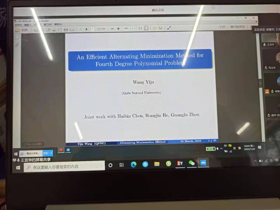 12月8日,应数学与信息科学学院的邀请,曲阜师范大学王宜举教授在线上会议为我院师生作了“An efficient alternating minimization method for fourth degree polynomial optimization” 的学术会议。伟德官网下载苹果版的相关专业教师、研究生、本科生等共三十余人参加了线上会议。会议由数学与信息科学学院崔鲁宾老师主持。 王宜举教授从一个NP难的二次二次优化问题(BOP)入手,给出了BOP与多线性优化问题(MOP)之间的等价性,并提出了一种改进型BOP与近端交替最小化的收敛性算法。会后,王宜举教授对该模型现实应用前景作了展望,并与现场师生进行了互动交流。报告内容充实,讲解生动,使我院师生受益匪浅。