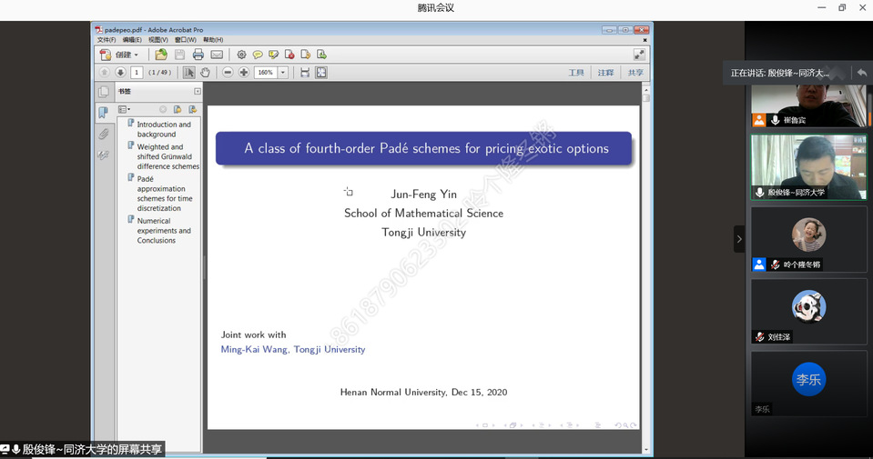 12月9日,应数学与信息科学学院的邀请,同济大学殷俊锋教授在线上会议为我院师生作了“A class of fourth-order Padé schemes for pricing fractional exotic options”的学术会议。伟德官网下载苹果版的相关专业教师、研究生、本科生等共三十余人参加了线上会议。会议由数学与信息科学学院崔鲁宾老师主持。 殷俊锋教授介绍Black-Schole期权定价模型及其相关知识,并提出了基于加权平移的gruanwold 模型和Padé逼近,并通过数字期权和障碍期权的数值实验证明了该算法的有效性。殷俊锋教授的报告内容丰富翔实,应用性强,为进一步的研究方向开辟了道路,拓宽了我校青年教师与学生的学术视野。讲座结束后殷俊锋教授还对我院师生提出的问题做出了详细的回答。