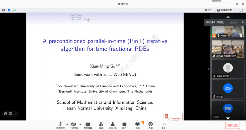 11月29日,应数学与信息科学学院的邀请,西南财经大学顾先明博士在线上会议为我院师生作了“A preconditioned parallel-in-time iterative solver for some classes of time-fractional PDEs”的学术会议。伟德官网下载苹果版的相关专业教师、研究生、本科生等共50余人参加了线上会议。会议由数学与信息科学学院崔鲁宾老师主持。 顾先明教授介绍了一类时间分数阶偏微分方程,并提出了一种新颖的PinT计算迭代算法,通过对角化技术同时求解在每次迭代中的所有离散时间点的PDE,最后分析算法的收敛性,证明出该算法的收敛速度是鲁棒的。会后,顾先明教授结合自己的求学经验,鼓励大家继续深造,为自己的人生规划另一条道路。顾先明教授的报告内容丰富翔实,深入浅出,观点新颖,启发性强,为同学们今后的科研工作和未来发展提供了深刻的借鉴意义。