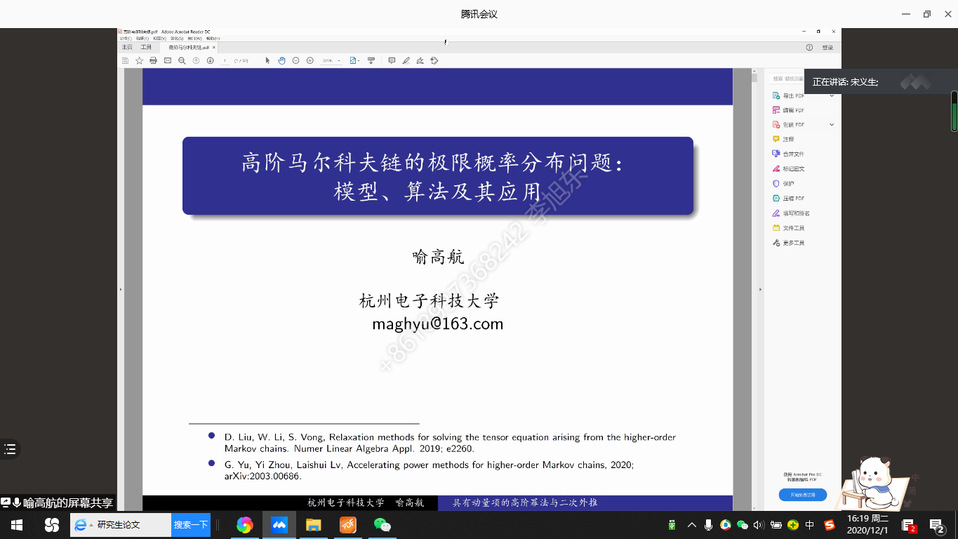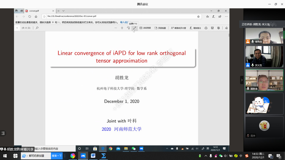 12月1日,应数学与信息科学学院的邀请,杭州电子科技大学胡胜龙教授、喻高航教授在线上会议为我院师生分别作了“Linear Convergence of an Alternating Polar Decomposition Method for Low Rank Orthogonal Tensor Approximations”与“高阶马尔科夫链:模型、算法及其应用”的学术会议。伟德官网下载苹果版的相关专业教师、研究生、本科生等共30余人参加了线上会议。会议由数学与信息科学学院宋义生、崔鲁宾老师主持。 胡胜龙教授介绍了低秩正交张量逼近问题,提出了经典APD的改进版本iAPD算法,并介绍此算法的四种优势。喻高航教授针对已经存在的幂法和反幂法,介绍了高阶马尔科夫链极限概率分布问题的外推算法,以及具有动量项的高阶幂法和反幂法,和二次外推算法。胡胜龙教授与喻高航教授的报告,从浅到深,简明清晰,拓宽了学生们的知识面,引起了在场师生的热烈讨论。