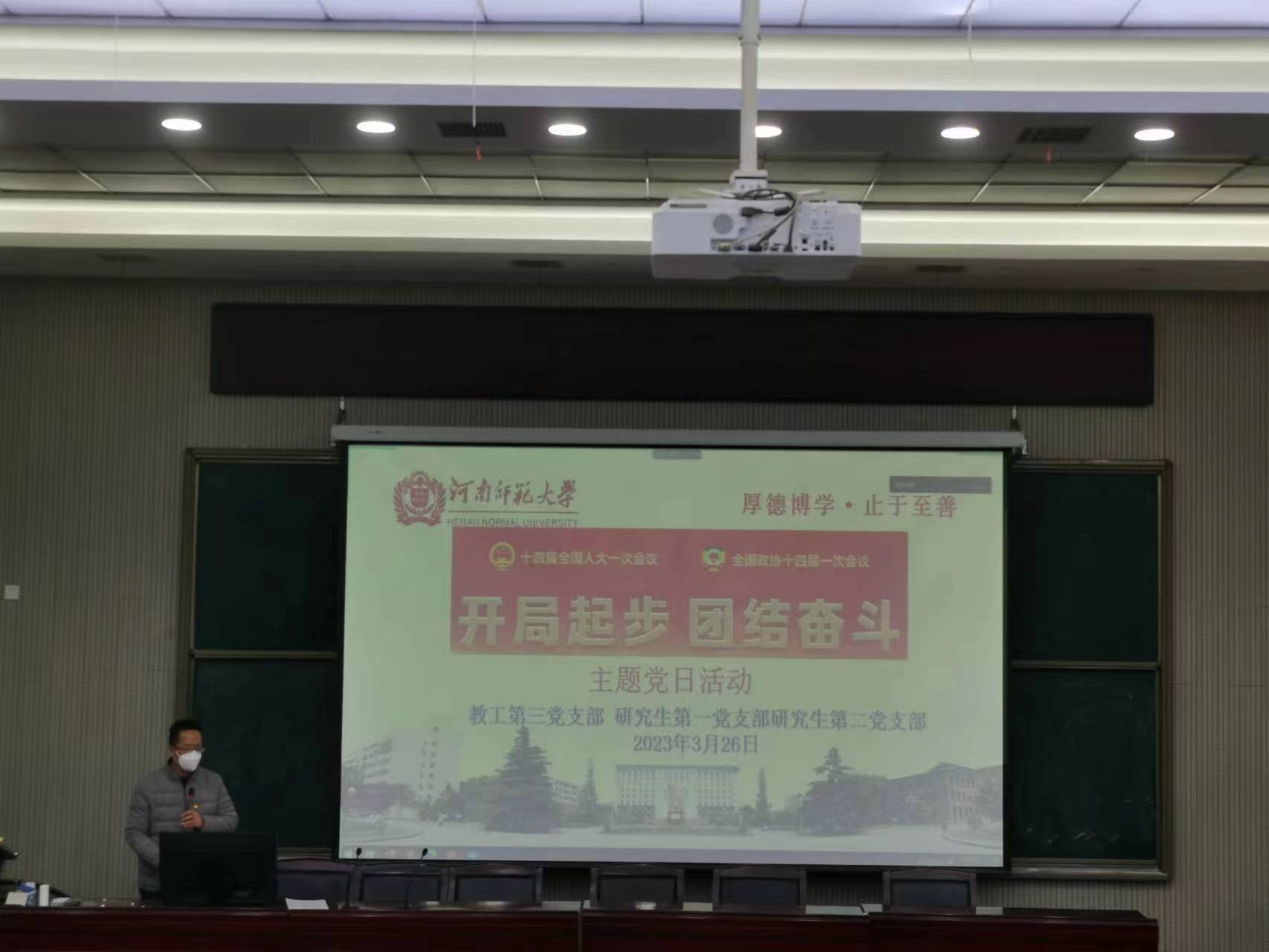 为深入贯彻学习全国两会精神,坚定理想信念,提升党性修养,紧跟新时代、迈向新征程,2023年3月26日下午,教工第三党支部、研究生第一党支部和研究生第二党支部共同举行“开局起步,团结奋斗”开展学习两会精神主题党日活动,活动由裴永刚同志主持。会议采取线下线上混合形式。