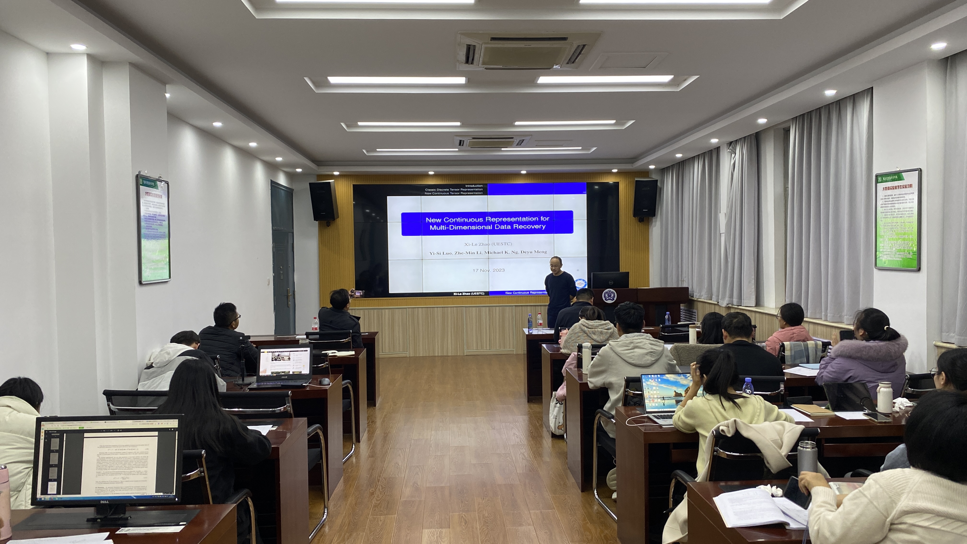 11月18日,应数学与信息科学学院邀请,电子科技大学大学赵熙乐教授做客百年校庆之“牧野格致”讲堂为学院师生作题为“New Continuous Representation for Multi-Dimensional Data Recovery”的学术报告,数学与信息科学学院师生共三十余人参加此次报告。 赵熙乐教授首先阐述了低秩张量在网格上表示的局限性,并说明其阻碍了低秩张量在网格以外的许多场景中的潜在适用性。随后,赵熙乐教授为了打破这一障碍,提出了一种低秩张量函数表示(LRTFR),它可以以连续表示网格以外的数据。最后,展示了广泛的多维数据恢复在图像处理、机器学习和计算机图形学等方向的应用。 报告结束后,赵熙乐教授就低秩张量函数表示的模型思想、实践难点、应用背景等相关问题与台下师生展开深入的讨论和交流。赵熙乐教授的报告内容丰富,使参会师生对低秩张量函数表示有了深刻的认识,受益匪浅。 专家简介: 赵熙乐,电子科技大学教授、博士生导师,中国工业与应用数学学会副秘书长,入选电子科技大学百人计划和四川省学术和技术带头人后备人选。撰写Elsevier出版社和科学出版社出版的学术专著章节2章,以第一或通讯作者在高水平期刊和会议发表学术论文60余篇,包括应用数学权威SIAM 系列期刊和图像处理权威IEEE系列期刊(TIP、TNNLS、TCYB、TCI和TGRS)及人工智能权威会议CVPR和AAAI等。主持国家自然科学基金面上项目和青年项目、四川省应用基础研究项目等。研究成果获四川省科技进步奖一等奖(自然科学类、科技进步类)、中国计算数学学会青年优秀论文竞赛二等奖、第一、第二届连续两届川渝科技学术大会优秀论文一等奖、首届四川省数学会应用数学奖二等奖。 (数学与信息科学学院 崔鲁宾 周纬翀)