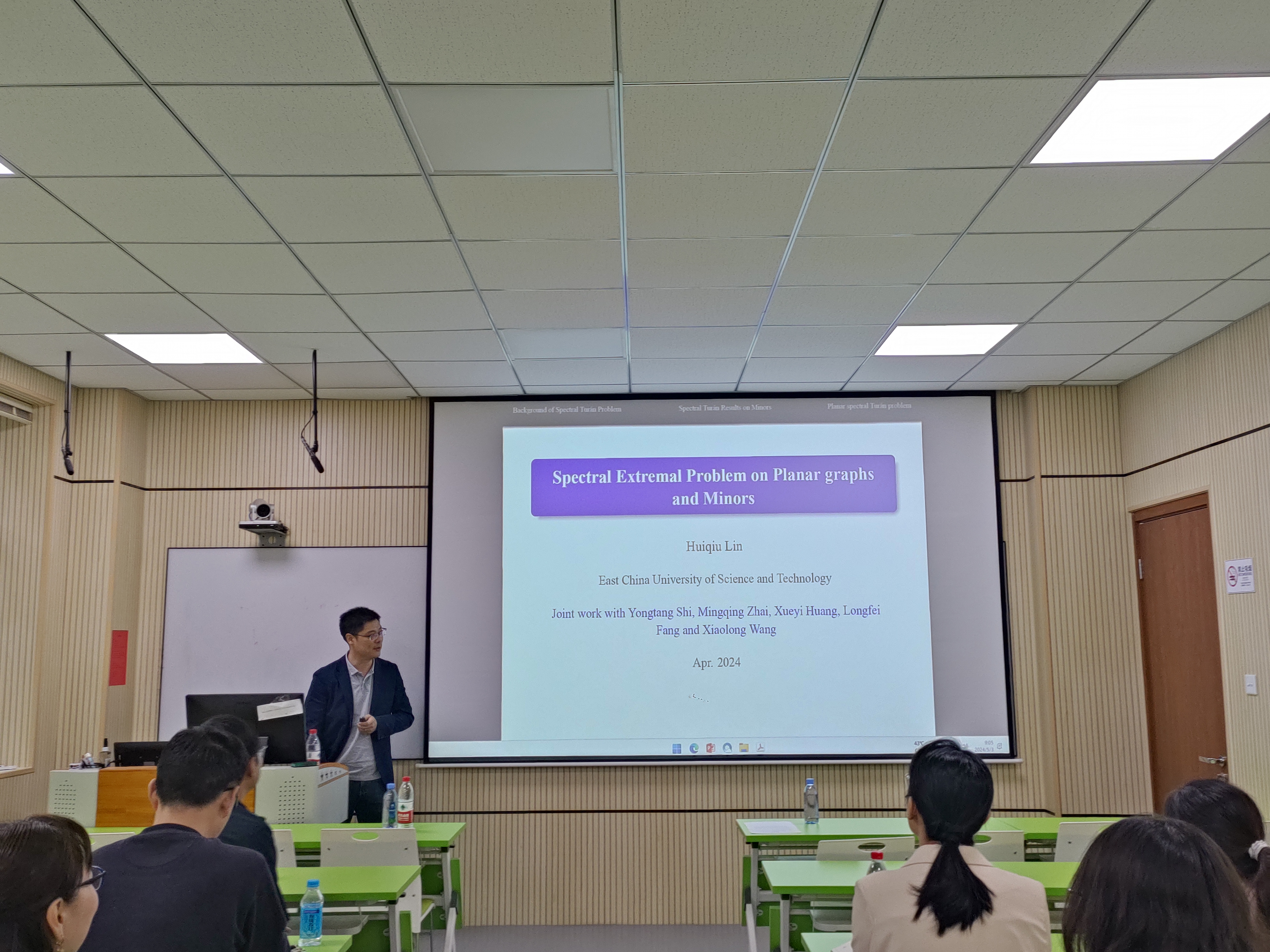 5月3日,应数学与信息科学学院的邀请,华东理工大学博士生导师林辉球教授为学院师生作题为“Extremal spectral results of planar graphs without vertex-disjoint cycles”的学术报告,相关专业教师和硕士研究生20余人参加此次报告。 本次报告主要介绍了图的谱极值问题的相关研究。林辉球教授首先介绍了谱极值问题的研究背景和研究现状,进一步引出报告的两个主要内容:具有禁用子式结构的图的谱极值问题和平面图上的谱极值问题。接下来,林教授介绍了具有禁用子式结构的图的研究背景和研究现状,从而引出了本次报告的第一组重要结论,即当禁用子图是一组子式的集合时,其谱极值图的结构可以完全刻画出来。上述结论以及其证明方法非常漂亮且具有一般性。最后,林辉球教授介绍了平面图上的谱极值问题的相关进展,刻画了禁用边不交的圈的平面图中谱半径达到最大的图。 报告结束后,林辉球教授对师生提出的相关问题进行了细致地解答。 专家简介: 林辉球,华东理工大学数学院副院长(主持工作)、教授、博士生导师,2013年博士毕业于华东师范大学。中国运筹学会图论组合分会理事。在图论的主流期刊《J. Combin. Theory, Series B》、《Combin. Probab. Comput.》、《J. Graph Theory》、《European J. Comb.》、《Linear Algebra Appl.》等发表学术论文60余篇。主持国家自然科学基金项目4项,目前主持在研国家自然科学基金面上项目。 (数学与信息科学学院 王婧) |